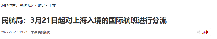 中国民航局在3月15日举行的发布会上宣布,近期,为缓解上海市疫情防控压力,经国务院联防联控机制研究决定,自3月21日至5月1日期间,调整部分上海入境国际客运航班。