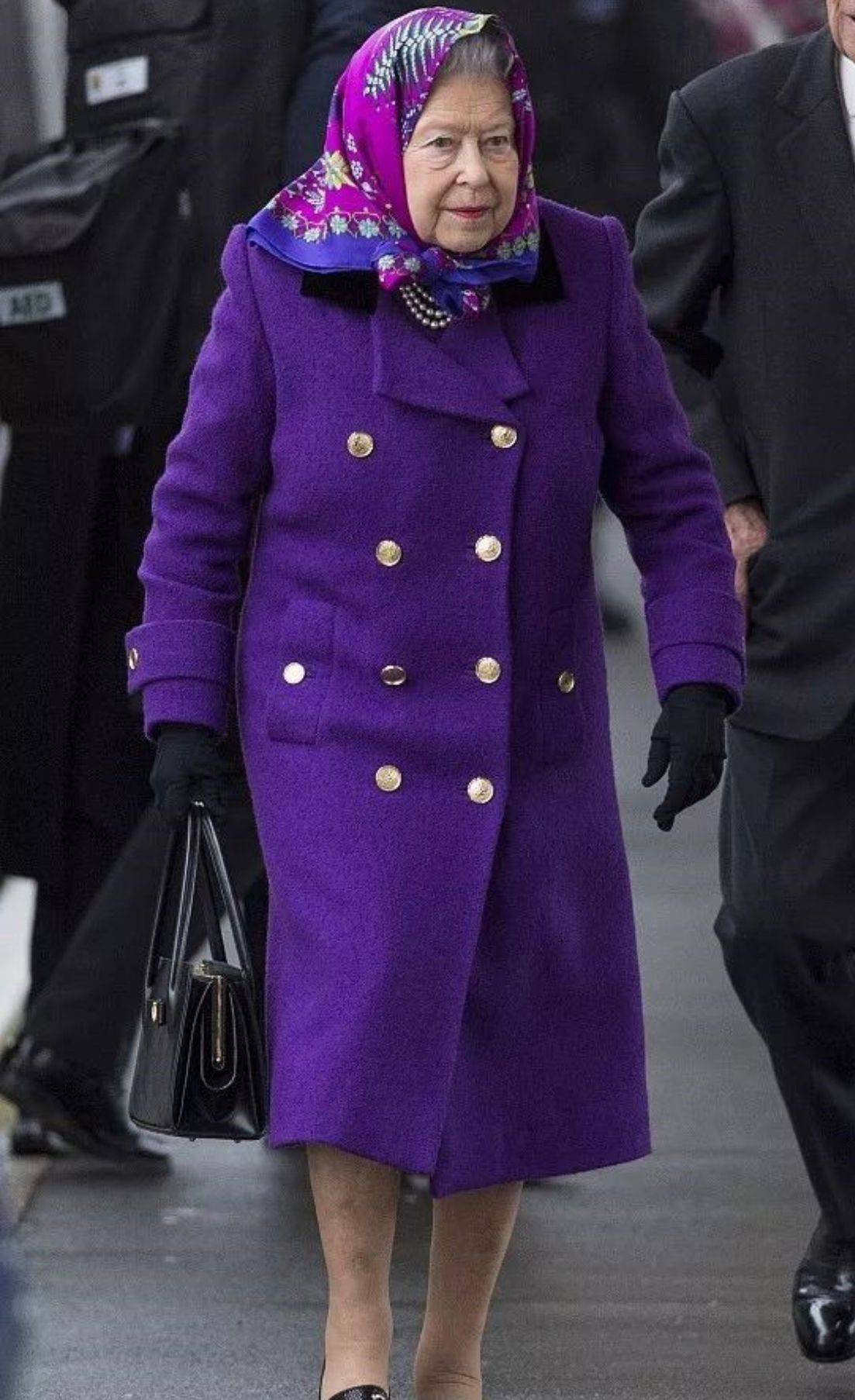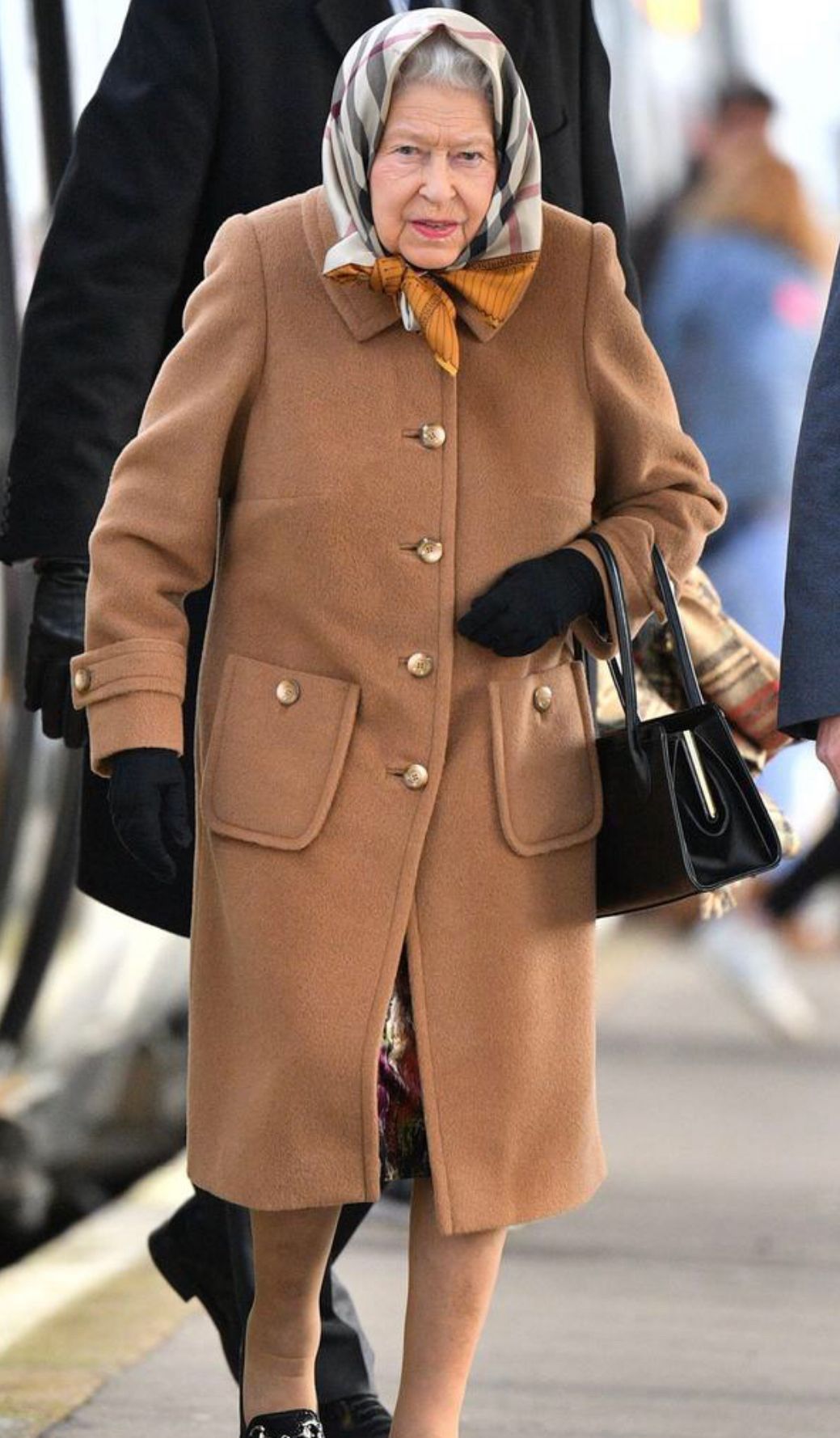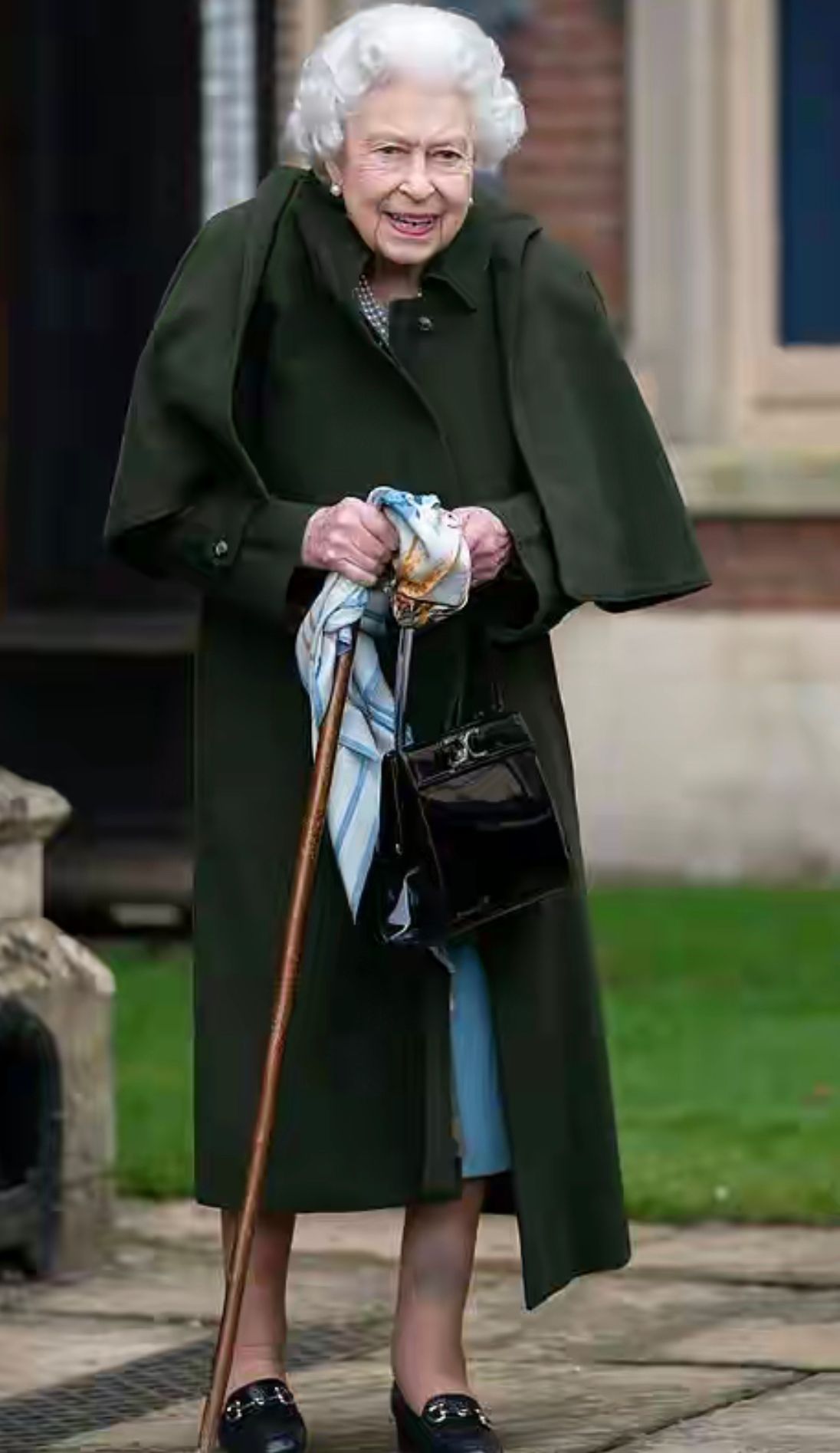 大衣的面料往往是属于硬挺材质的材质,所以上身效果会非常飒爽帅气,强化服装的轮廓线条,减少拖沓无形带来的影响。线条感流畅的廓形大衣,上部分贴合身材线条,下部分以阔摆设计为主,属于上修下宽的类型,所以也很具备扬长避短的作用,英女王佝偻着背,看上去状态不佳。