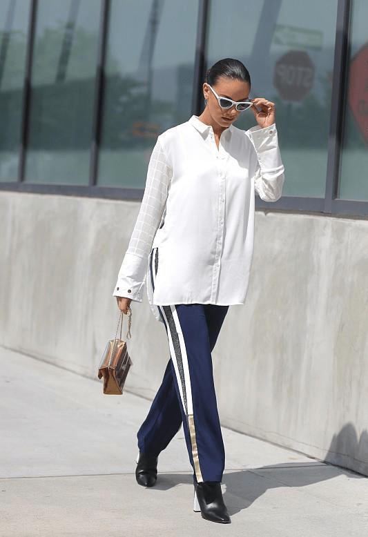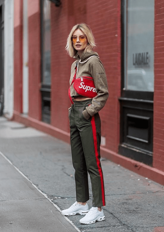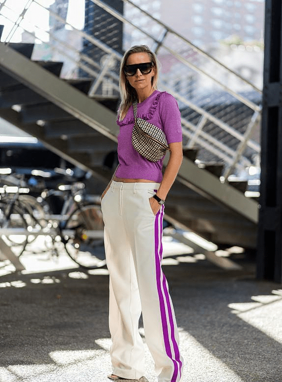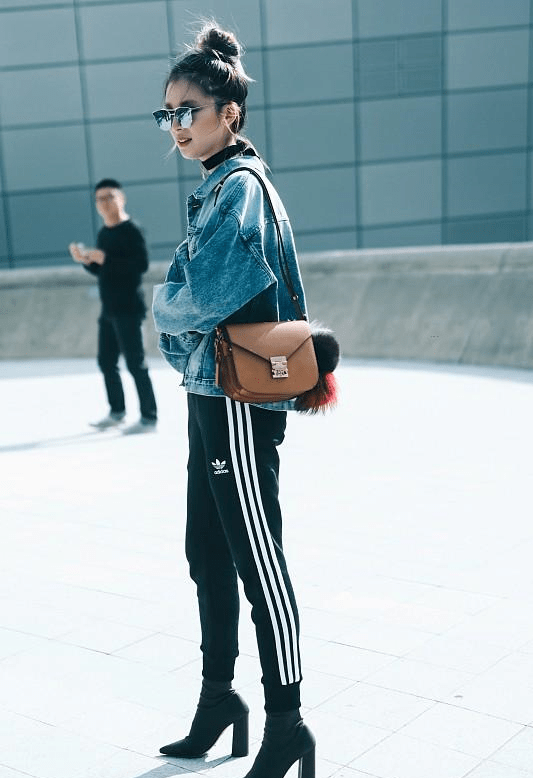 加上了条纹装饰的运动裤会比纯黑色的更常见,首先就是气质上明显更年轻一些,白色的条纹让运动裤的活力更明显,就不容易踩雷,其次就是加上条纹设计之后,运动裤的版型变得也笔直,显瘦效果也更好。 无论是紧身的,裤腿收紧的,还是阔腿裤的版型都比纯黑色的更显瘦。就是因为有了条纹的设计,这种运动裤才特别好搭配,当然还是搭配短款的服装更干练。例如,短款的牛仔外套,白色的上衣等等。不去搭配运动鞋而去搭配更高级的高跟鞋,也是让你的裤装穿搭更时髦,腿更长的一个小技巧。