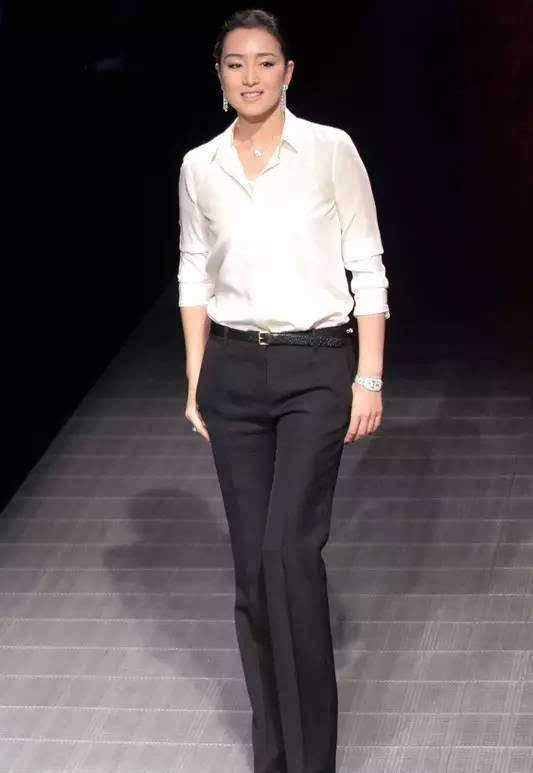 想要裤子更修饰腿型、显腿长,高腰和直筒的裤形特别推荐。高腰将腰身上移,让腿长的比例更加优越。如果搭配拖地的长度,视觉延伸的效果惠更明显,显腿长的效果也会更好。图中巩俐这条裤子的腰身并不是很高,但直筒拖地裤的优势也已经展现,高级感和显瘦显腿长的效果都是一流。