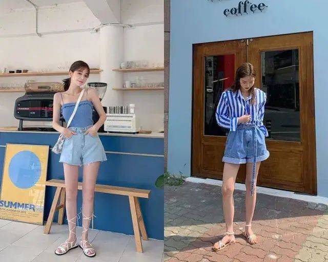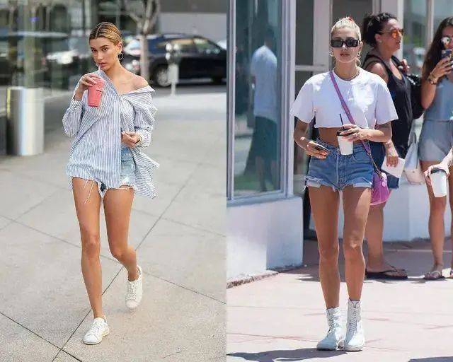 在夏季短裤类型中牛仔短裤绝对是出场率最高的。主要是牛仔短裤非常的百搭易上手,与很多上衣单品都能穿出好看的造型,像搭配一件常见的素色T恤+加一双帆布鞋就能搭出青春活力的美少女look。也可以把T恤换成更加吸睛的短版上衣或吊带背心,秀出性感的锁骨与纤细的腰肢,让造型更加的迷人。(小tips:穿吊带背心时可以配上一件透肤上衣会更好看噢!)不过小楠更推荐牛短裤搭配男友衬衫的搭配公式,宽松的男友衬衫给人感觉随性慵懒,喜欢时髦一点可以像比伯嫂比伯海莉那样半露香肩,彰显女人味。当然比伯嫂的穿搭一般都是比较大胆的,如果驾驭不住可以低调些直接选择条纹宽的蓝色衬衫来搭配牛仔短裤。