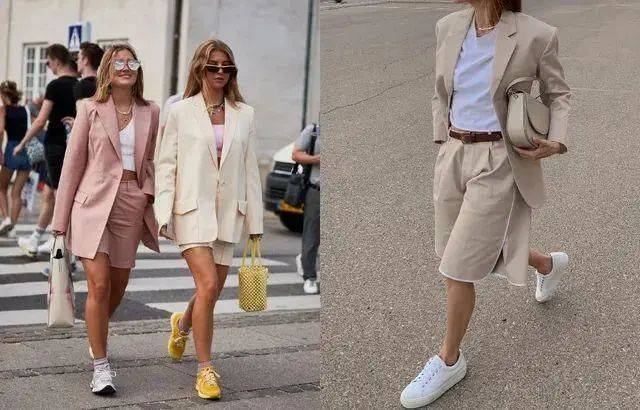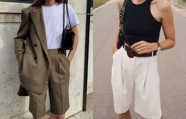 对于百慕大短裤,或许一些小仙女们会感到比较陌生, 百慕大短裤是 英文Bermuda Shorts直接翻译过来的,指的是膝盖上2到3厘米的短裤。也俗称为我们熟知的五分裤。这类型的裤款宽松舒适,非常的能遮肉,但其也有缺点就是如果穿搭不注意就很容易搭配显腿短的五五身造型。小楠推荐的搭配公式是薄款的单西外套+短版上衣+百慕大短裤,或者衬衫或T恤扎入百慕大短裤中,营造出飒爽帅气的微中性风日常搭配。