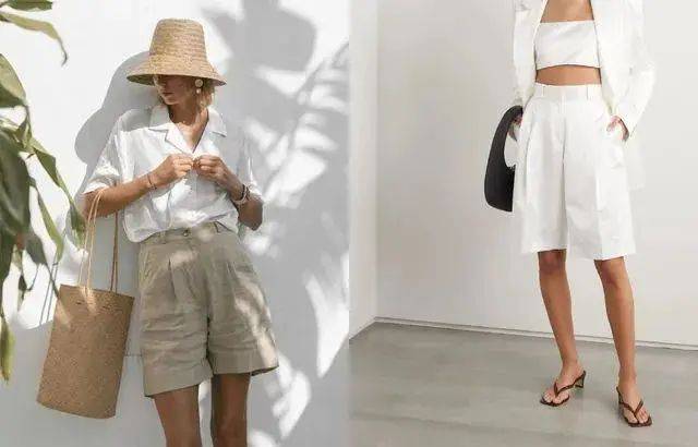 首先要介绍的是短西裤,作为正常西裤的缩短版,短西裤保留了西裤的利落感和些许正式感的同时更多了一分的轻盈感,在夏季用来凹造型时,最简单的就是搭配短西裤+T恤,尤其是白色T恤百搭不挑色。清爽点可以选择削肩上衣来搭配短西裤,利落飒爽。日常上班想要正式感多一些那直接选择短西裤+薄西装外套+T恤就可以啦。五五身的女生可以把上衣扎入裤腰里露出腰线,或者短西裤选择膝上五公分也是可以的。
