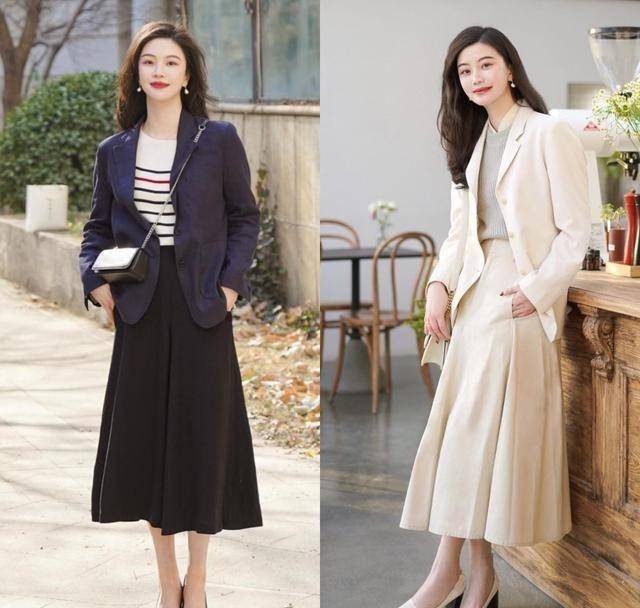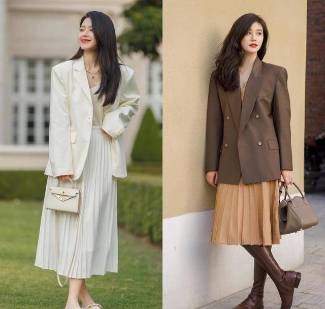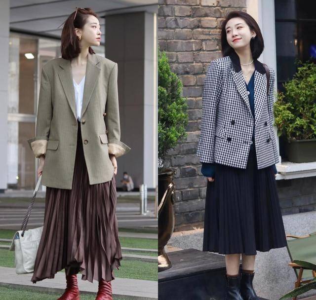 虽说这种宽松的西装穿起来舒适,但是小馆并不建议肩膀宽、胳膊粗的身材去穿,下身配的百褶裙,要选择垂感好的面料,这样才能在视觉上呈现出显瘦的既视感!
