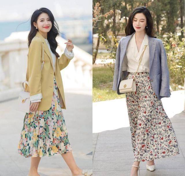 为了避免与碎花裙搭配在一起带来视觉审美疲劳,西服款式的选择尽量以纯色系为主,并且两者之间配色上要有对比感,才能更好地提升造型层次感。