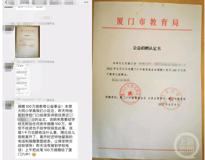 上游新闻记者从谢先生发的《公益捐赠认定书》看到,“本单位认定谢某某,2022年9月9日向厦门六中教育基金会捐赠人民币100万元用于教育公益事业。”落款为“受赠单位:厦门六中教育基金会;业务主管单位:厦门市教育局”并盖上鲜章。9月16日上午,上游新闻记者致电厦门六中教育发展促进会求证,接电话的工作人员向记者确认接受了这笔捐款,并表示“对,捐赠了(100万元),(我们)不接受采访,谢谢”,随后挂断了电话。