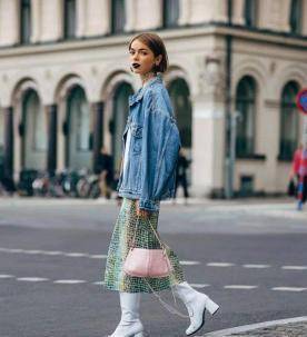 亮色将人们从古典的牛仔裙中带出来,又走进了当下,也算是“古今”结合了。牛仔裙颜色不要选择过深,颜色过深的牛仔裙是不太容易被其它单品中和的。