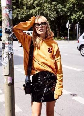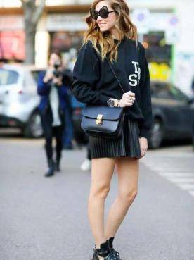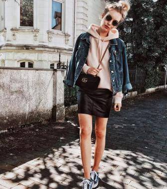 但和卫衣撞上的皮裙就好像“被缰控制住的野马”,不仅保留了皮裙固有的狂野,卫衣又为皮裙增上了活力。搭配皮裙的卫衣颜色要与皮裙有较大反差,否则就是一个暗黑系少女了。