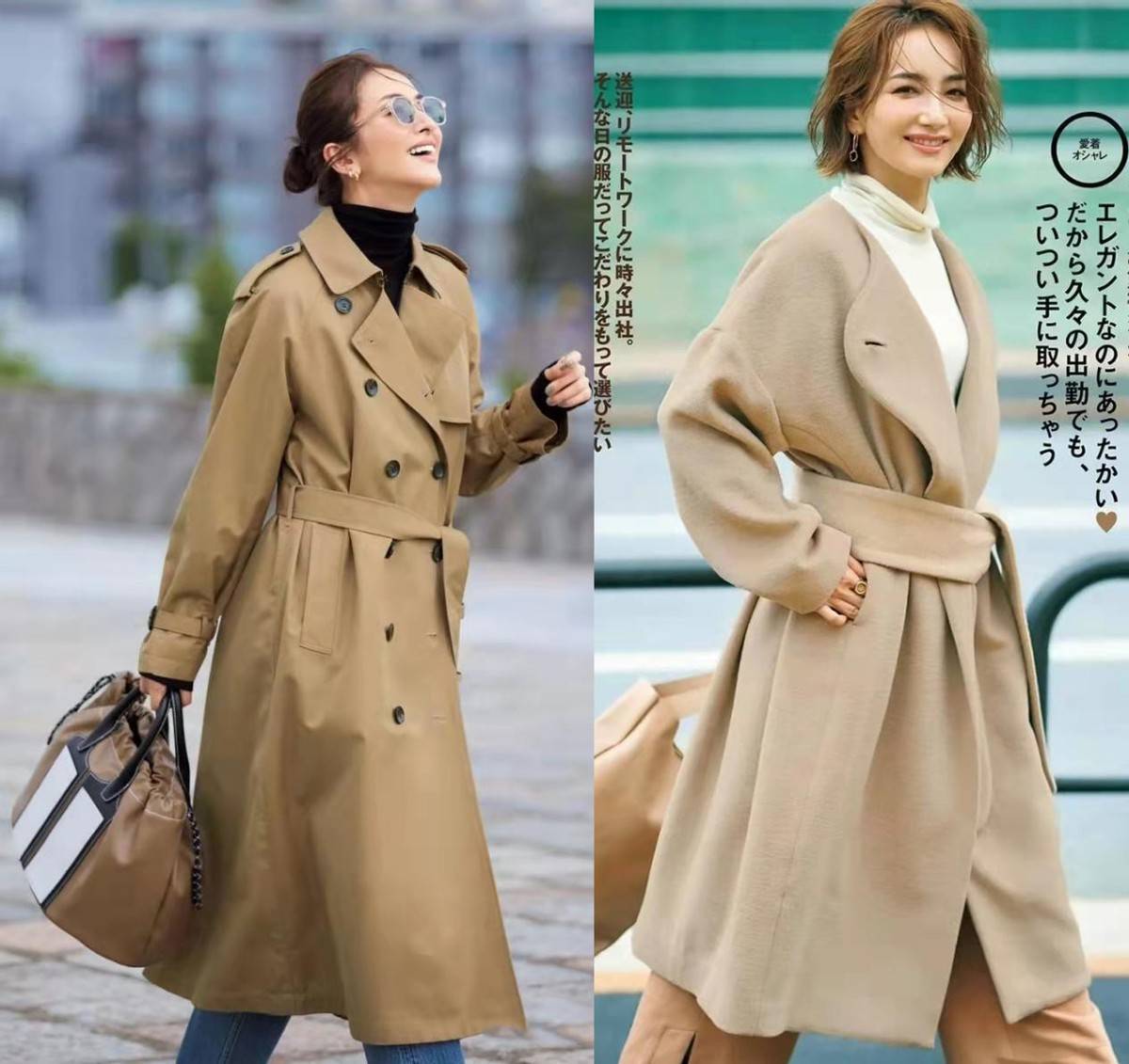 当天气越加寒冷的时候,大衣比起风衣要更加温暖,这也决定了大衣的材质要更厚重,从图中也能看出,右图的这件大衣看上去更有分量。而将它与浅色设计搭配,可以避免笨重的既视感,再匹配一件白色上装,就会显得整体比较轻盈。