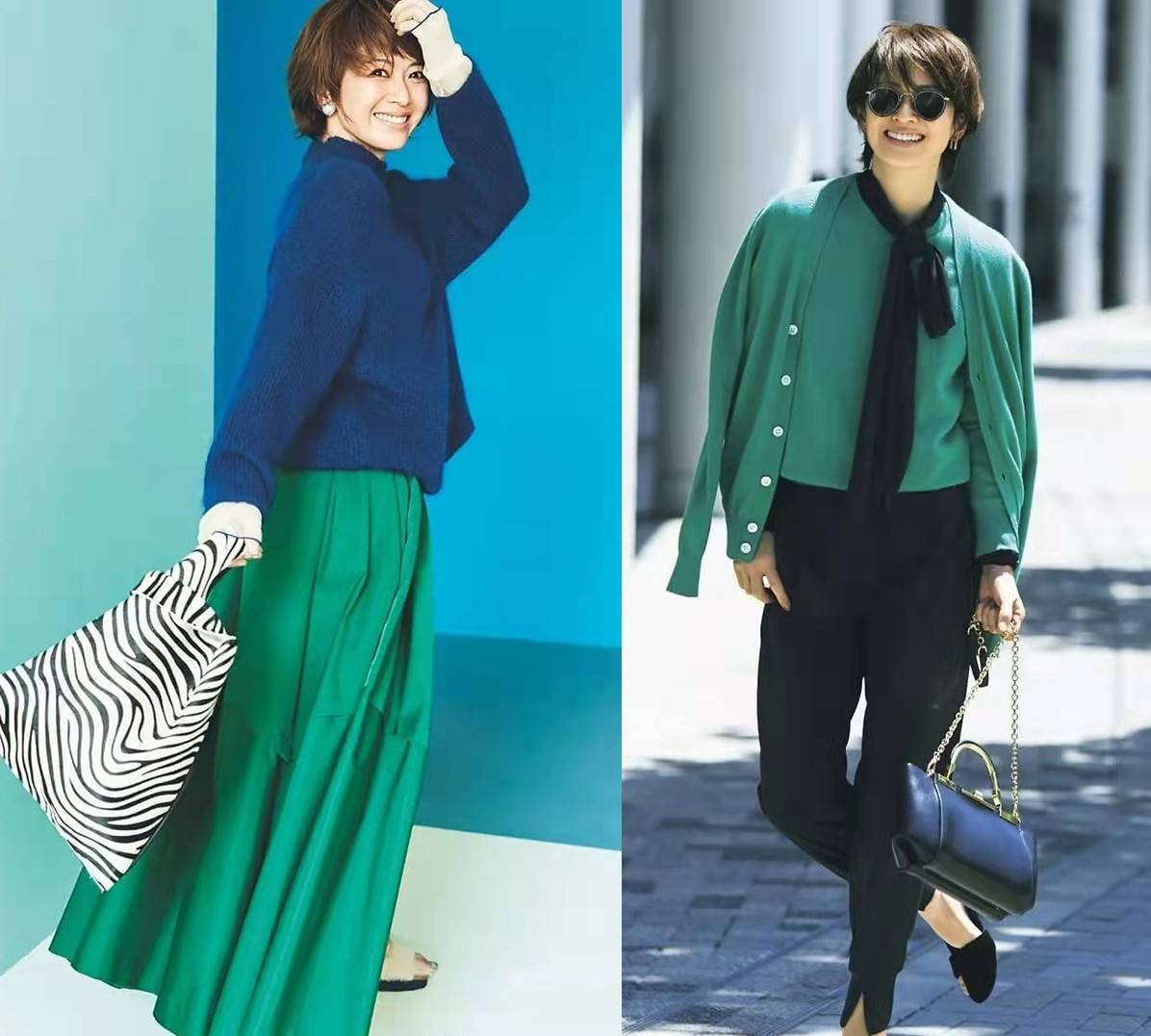 这种饱和度偏深的绿色,它在穿搭中表达出的清新风格更偏于成熟,可以自然地打造出一身沉稳大方的造型,是让大龄女性很有安全感的色调。
