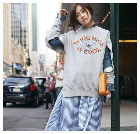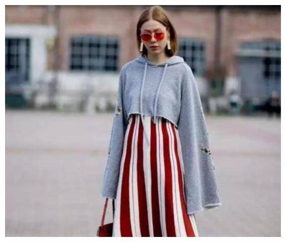 卫衣搭配裙子或阔腿裤可以中和卫衣的性感,展现出一点柔软感。刘云穿着Ports1961卫衣,条纹衬衫连衣裙上富有层次感,增加了凉爽和柔软。