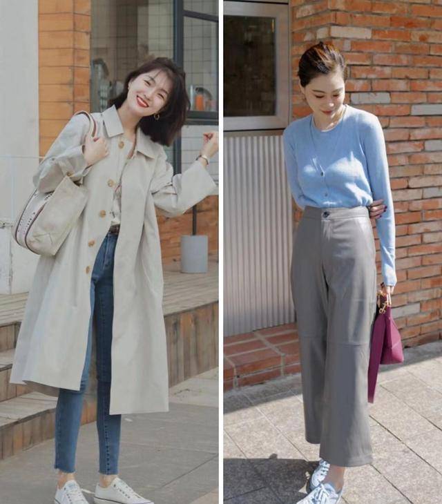 秋日里,除了外套我们也不能忽视脚上的鞋子,如平底鞋就是不错的选择,我们可以穿休闲风白色帆布鞋搭配奶茶色风衣,很是活泼减龄,显年轻。