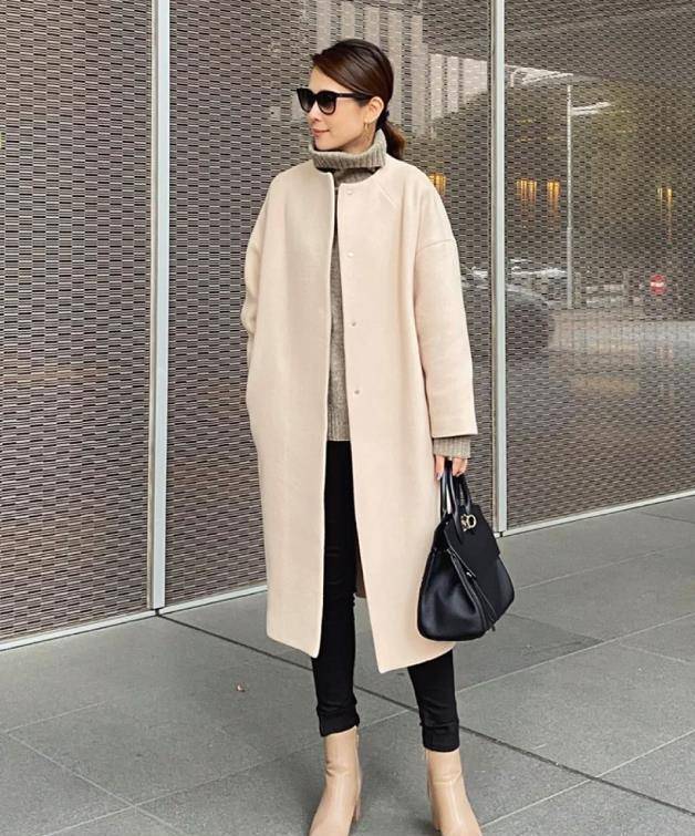 在秋冬季节里,除了大衣之外,靴子也是必不可少的单品。40岁的女人,在秋冬,建议给自己选择一双粗跟及踝靴,像这种高级的裸色,加上方头设计,这样一双靴子穿起来可显气质和显瘦了。上身选择了杏色毛呢大衣,内搭浅灰高领毛衣,太保暖时尚了。