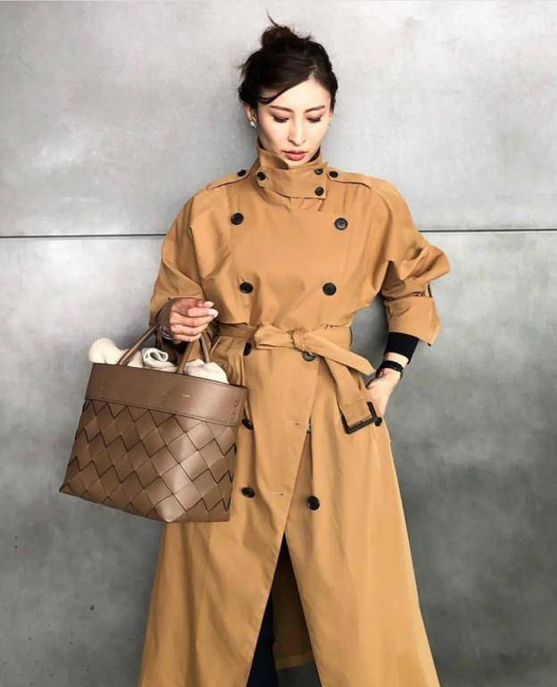 深卡其色长风衣,真的太经典时髦了,而且,这个颜色还很适合秋冬季节,温暖低调又不失优雅。系腰带的设计,天气冷的时候,将其系起来穿,保暖又显利落。至于内搭,上衣建议配毛衣、打底衫等,或者利用下叠穿也是超不错的。下身可以配裙子或裤装都好看。手上提着的棕色包包,让秋冬气息更浓郁了一些。