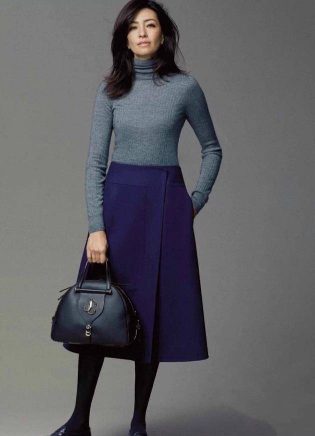 看看这一位日系博主,灰色打底衫+藏蓝色中长a字半身裙,a字版型的裙子,穿上能够很好修饰下半身的肥胖,适合臀宽、粗腿的身材。大冬天出门,记得再外搭一件长大衣,裙子里也适当增加一条打底袜裤,保暖又好看。脚上踩着一双黑色平底乐福鞋,显气质又高级。