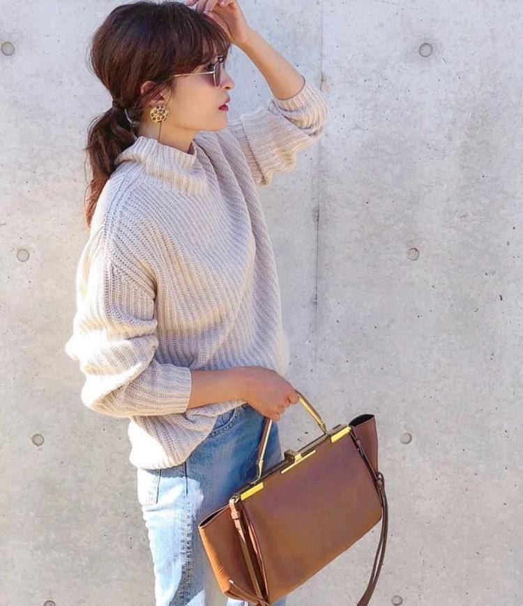 对于进入40+以上的中老年女人来说,在穿搭上,除了要选对衣服之外,穿对适合自己的颜色也十分重要。虽然过于鲜艳的颜色不适合穿,但相对沉闷的色彩也不必每天都穿,比起黑色,颜色饱和度低一些的衣服更适合大龄女性。米白色毛衣+水洗蓝牛仔裤,这一套搭配,颜色上是很清爽干净的。秋天的时候,单穿一件毛衣正合适,不用担心会冻着了。如果觉得自己驾驭不了大面积的棕色,也可以选择小面积的棕色单品来搭配,例如:棕色围巾、棕色鞋子,棕色包包等,