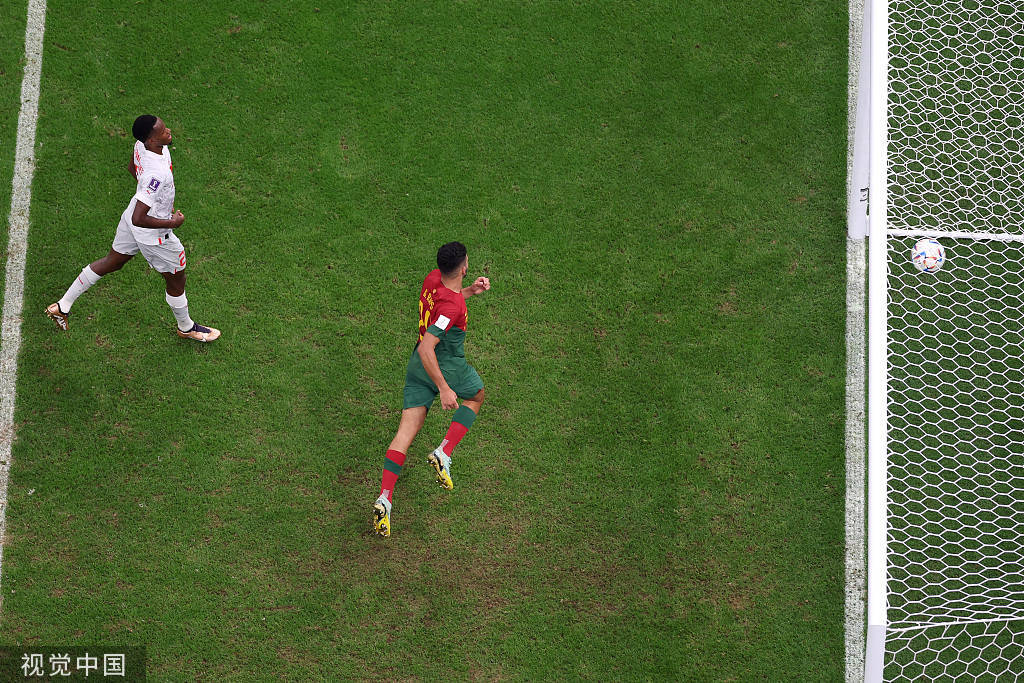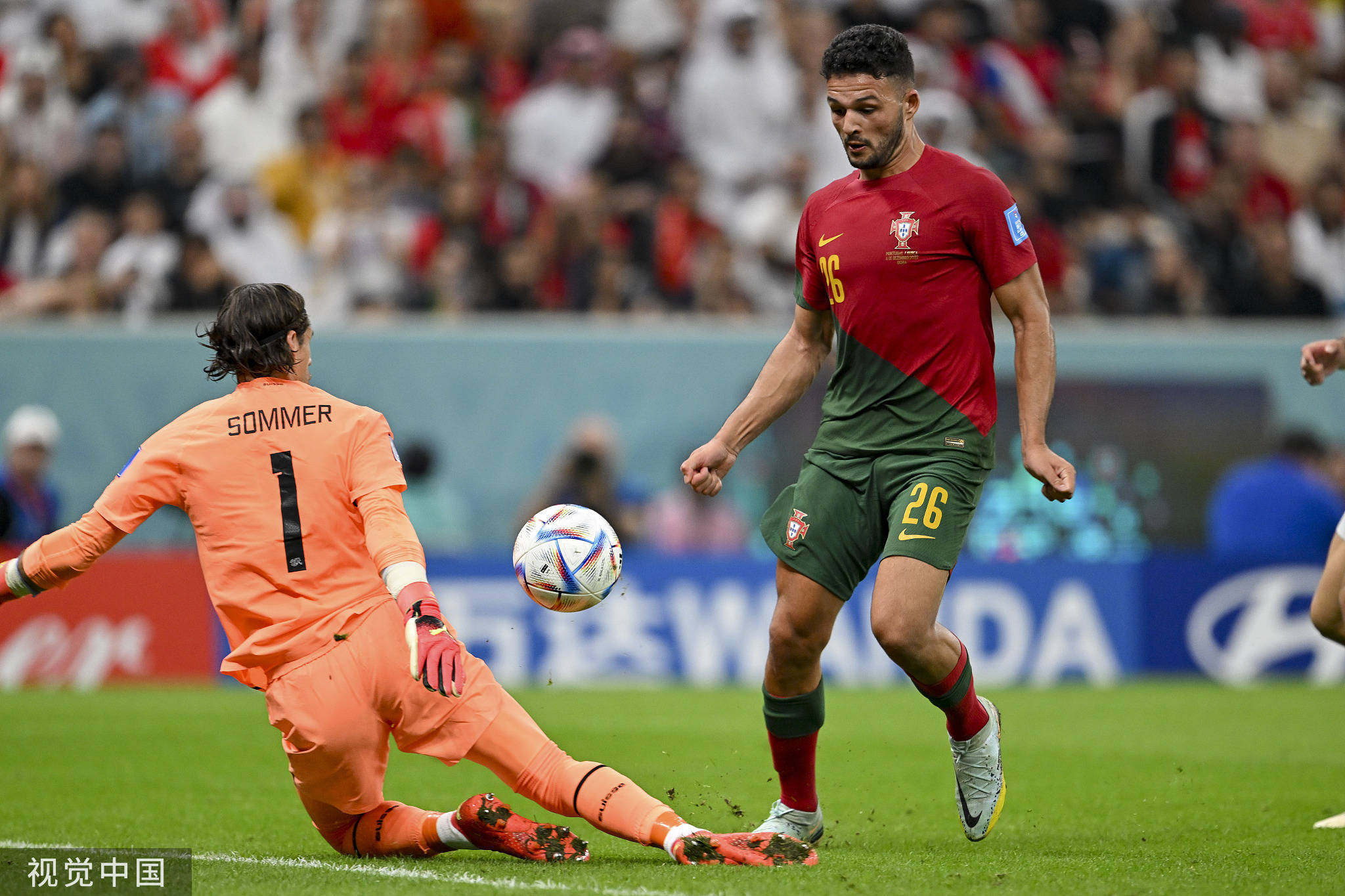第67分钟,菲利克斯在禁区弧顶前的一脚斜塞给到右侧的拉莫斯,后者禁区内面对门将的挑射,皮球入网,葡萄牙5-1瑞士。