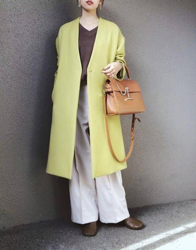 而加了绿色的黄色大衣,也是不错的选择,能够帮你衬托出白皙细腻的肤色,自然也就能够帮你显年轻一些。冷黄色外套内搭棕色系打底衫,下半身一条白色阔腿裤,脚上一双棕色系鞋子,颜色呼应,非常的利落又爽朗。