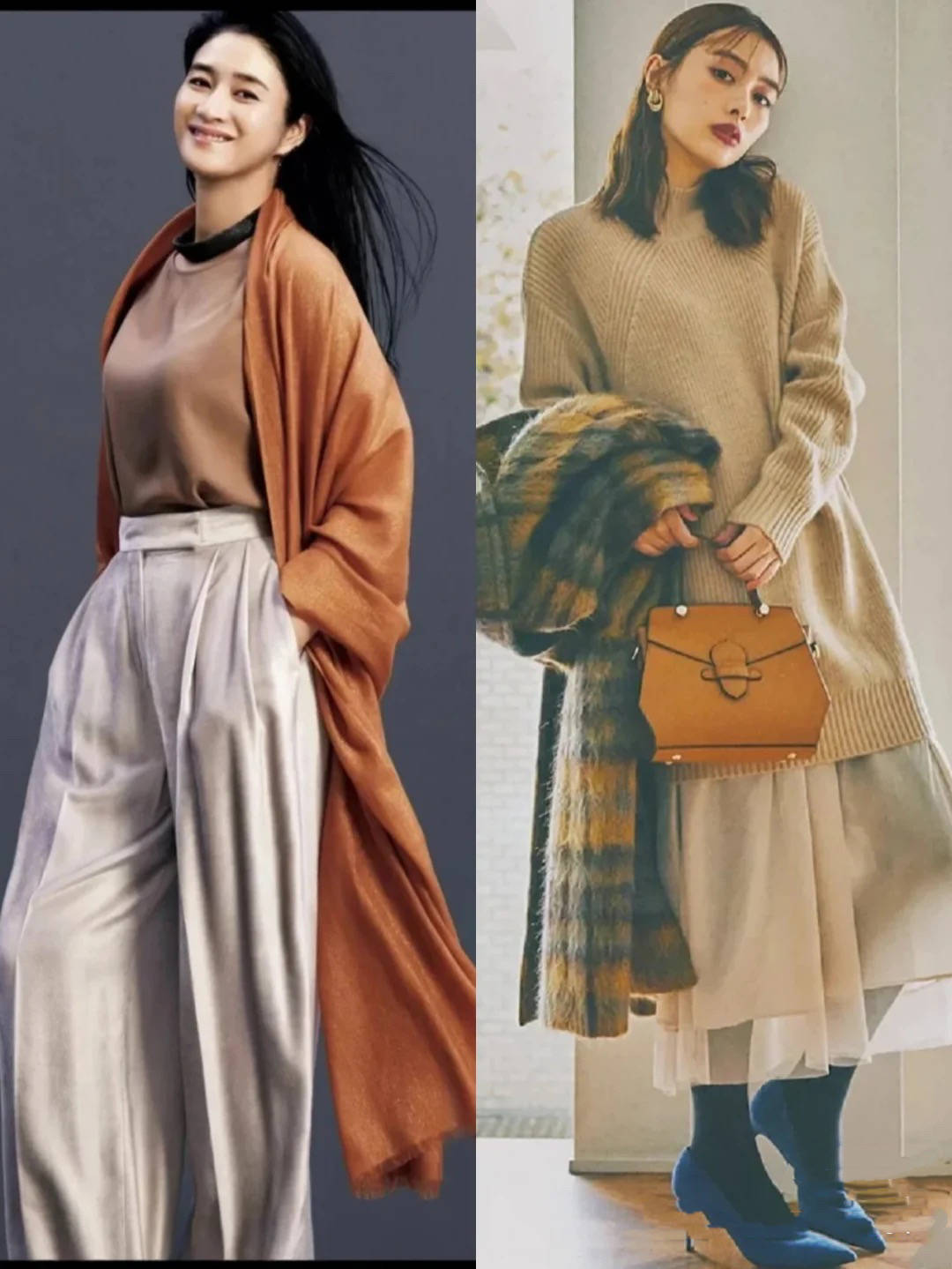 温柔大气的穿搭,必然是充满了大女人的气质。服装的风格、色系、款式,都更加优雅知性起来。可以带上几分帅气,但从来不会显得浮夸。 比如优雅的毛衣裙,或者垂坠的大衣,高腰的阔腿裤。在40+的女人身上,都是格外常见的。用卡其色的毛衣,搭配米白色的纱裙,简约中带着几分温柔,大方又显气质。