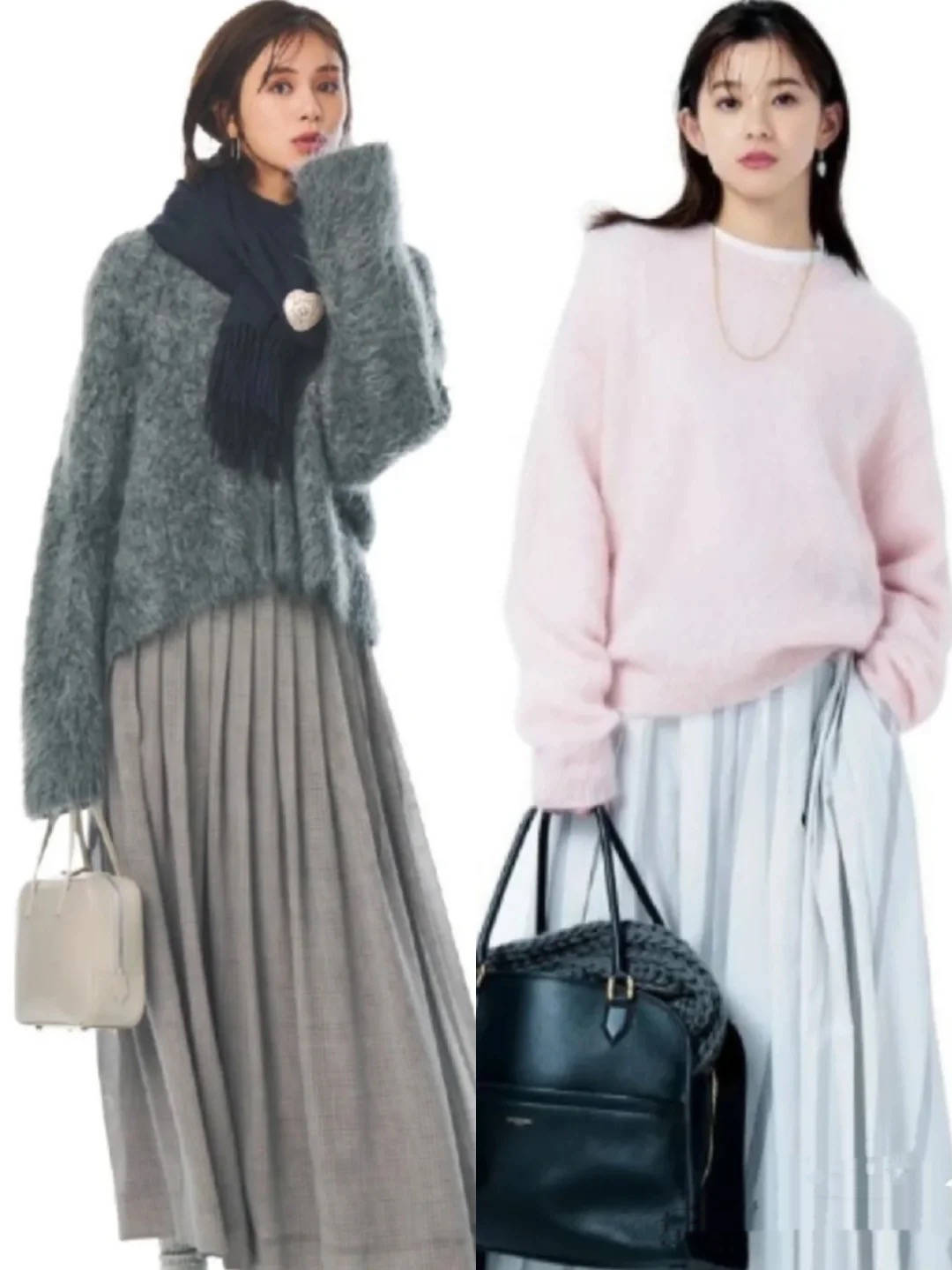 40+的女人,也有着温婉静谧的一面。即便是通勤风的穿搭,也可以尝试相对柔和的风格。比如这种简约又甜美的马海毛毛衣,可以尝试柔和的粉色,或者慵懒的灰色。 不管是灰色马海毛毛衣,还是粉色马海毛毛衣,都可以搭配浪漫又轻柔的百褶裙。自然的收腰款式,搭配上塞衣角的方式,可以呈现出更加浪漫柔和的气息,弱化年龄感。