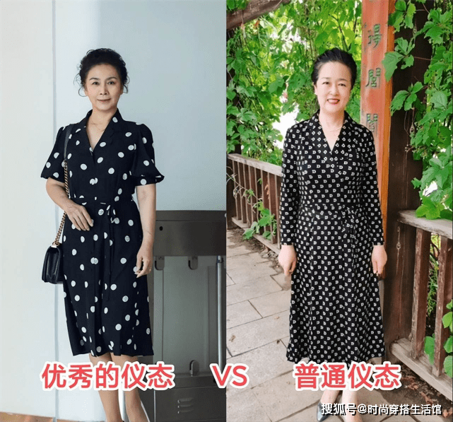 同样的衣服,仪态不同,效果也会不同。就像文中的两位妈妈,款式类似的黑色波点裙,左图里的妈妈,从表情管理到肩颈线都是优越的,骨子里的优雅与自信不言于表,而右图中的妈妈表情不自然,甚至有点肩怂驼背的感觉,显老态。
