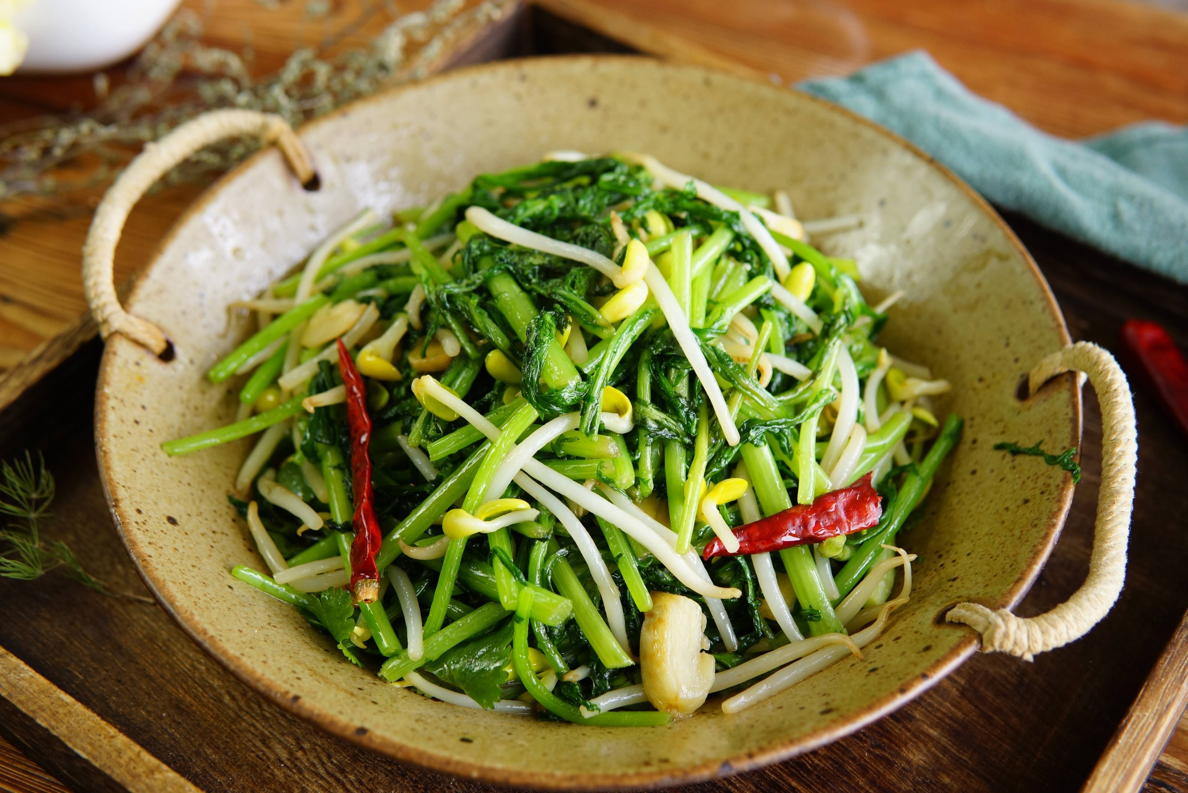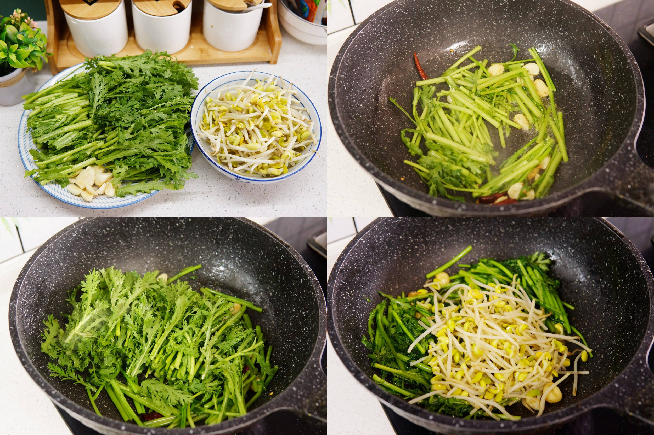 食材:茼蒿一把、黄豆芽、干辣椒、大蒜