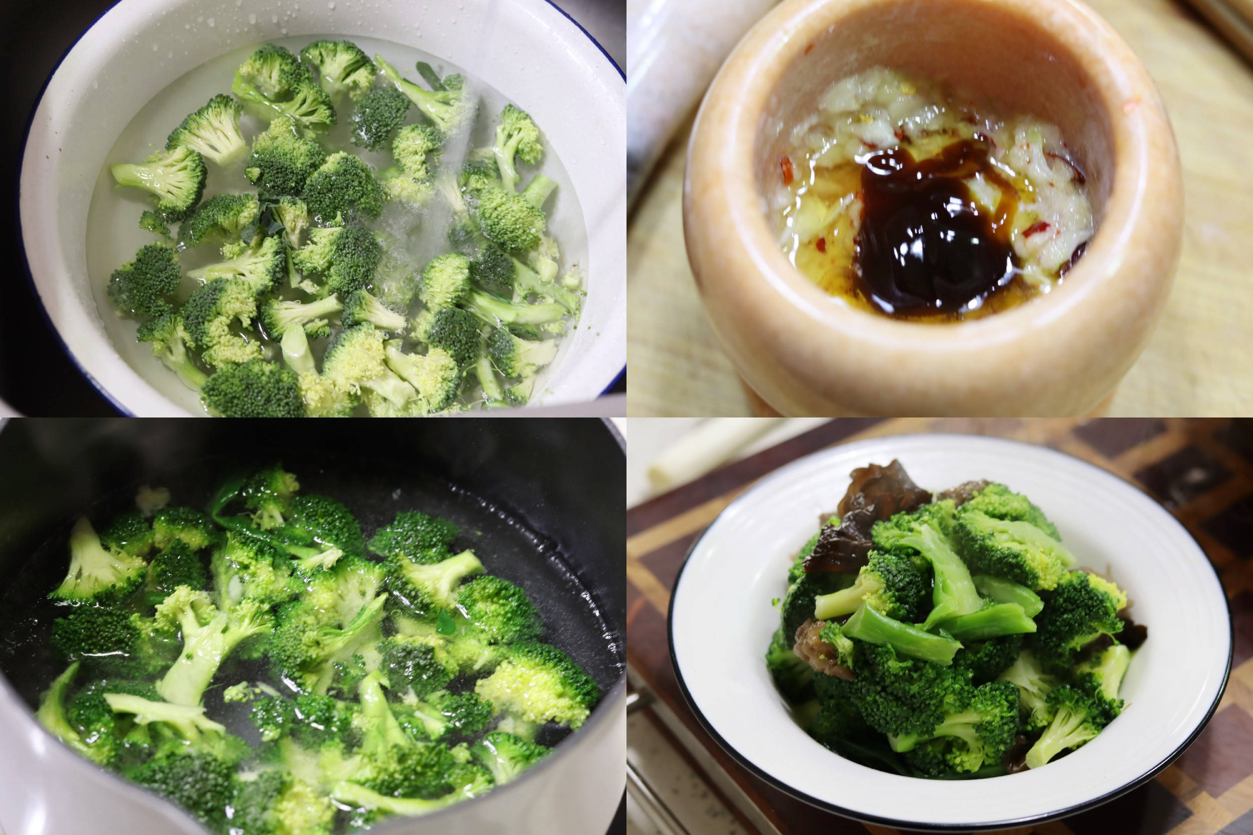 3、煮锅接清水,大火烧开,放一勺盐和一勺油,倒入西兰花焯水一分钟左右,捞出控水。倒入黑木耳,焯水煮3分钟,煮熟后捞出。