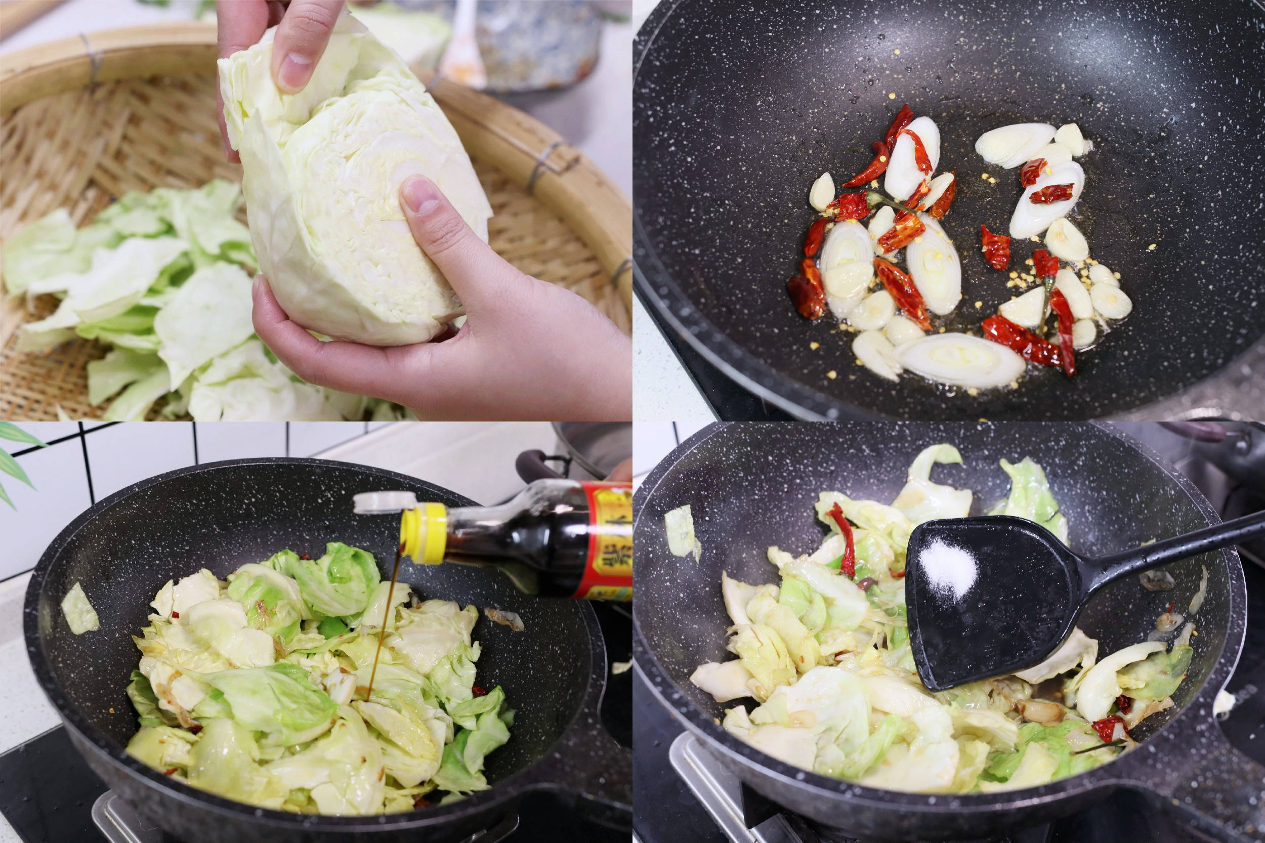 食材:包菜半颗、干辣椒、大蒜、大葱