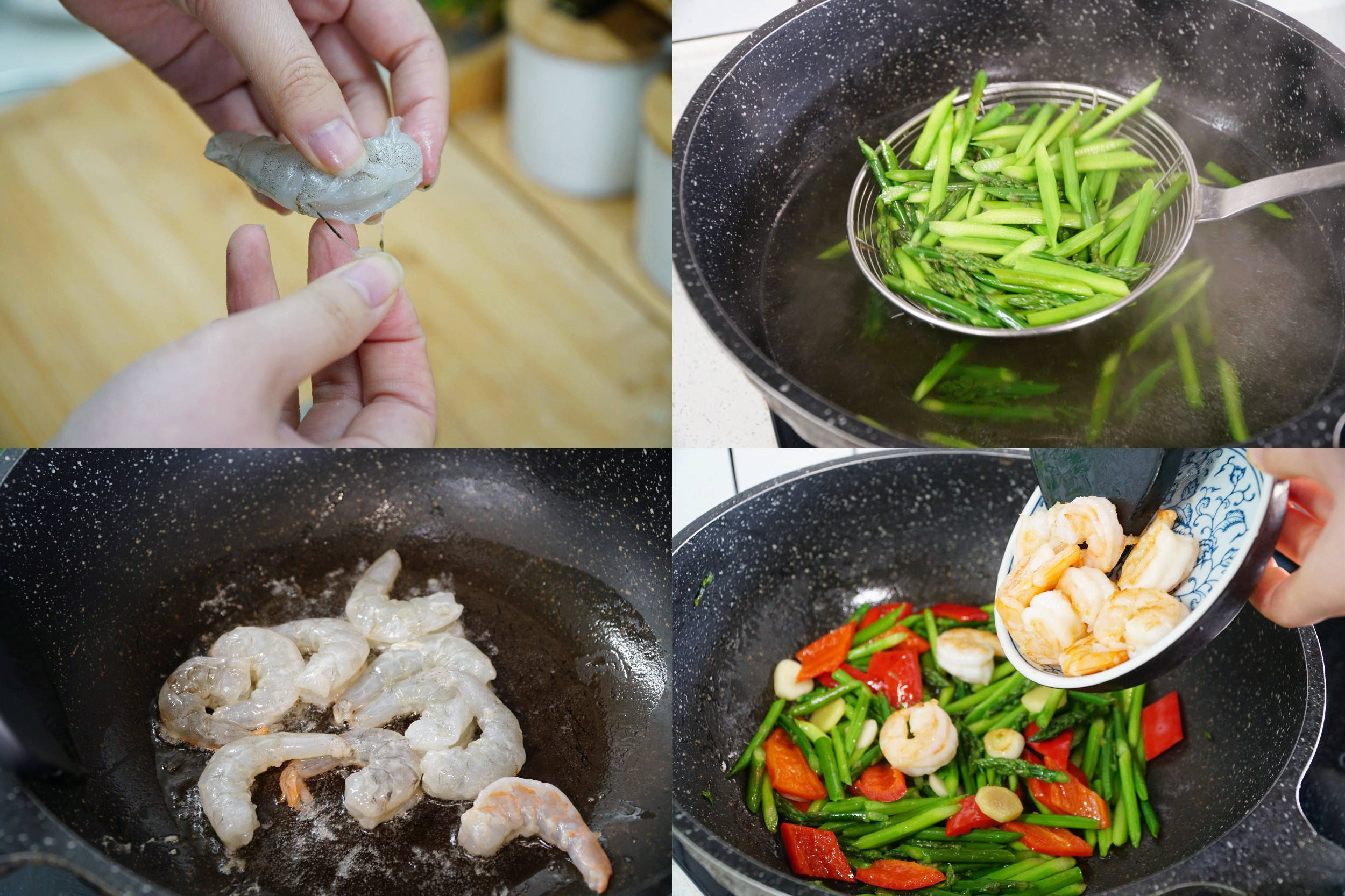 1、鲜虾去头去壳,开虾背去除虾线,洗净控干,放半勺料酒、一勺淀粉和半勺盐抓匀腌10分钟。 2、芦笋削皮洗净,切成五厘米左右长段,煮锅接水烧开,放半勺盐和油焯水煮两分钟捞出控水。另将红椒切片,蒜和姜也切片备用。