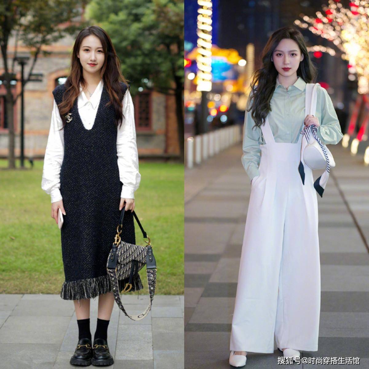 而比较新潮一些的叠穿方式,就是用衬衣和背带裙或是背带裤组合。用衬衣和“连体款”下装叠穿,不仅增添了层次感,还能降低衬衣过于正经的属性,打造出新潮、前卫的感觉。