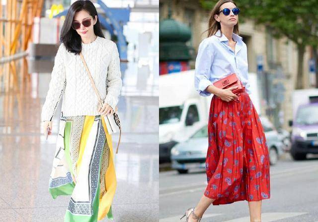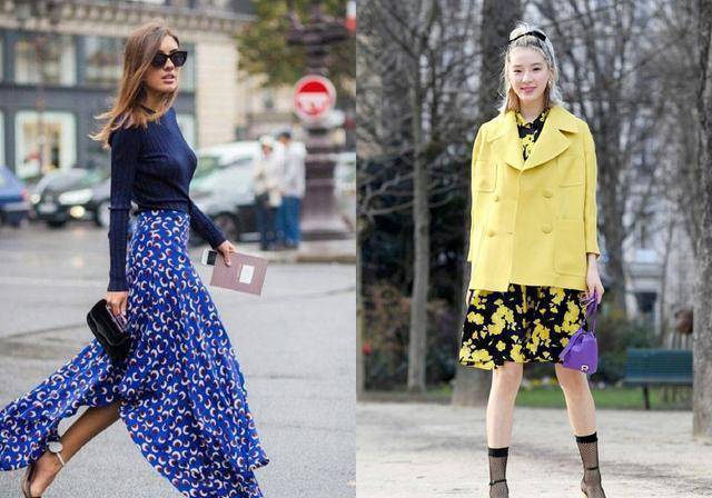 比如这种,白色毛衣搭配黄绿色印花裙,显得清新又自然。浅蓝色衬衣搭配红色印花裙,亮色系的底色也能更好驾驭。