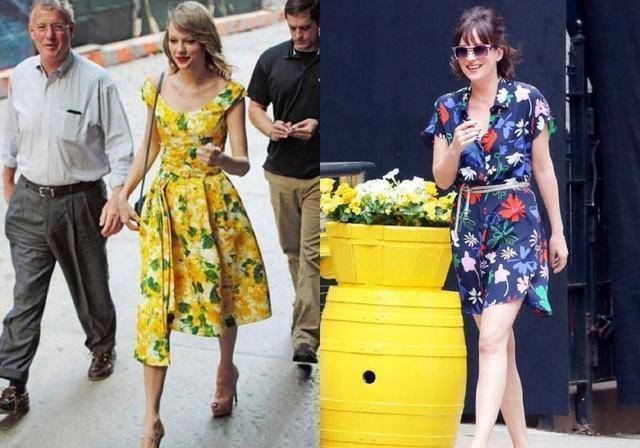 与左边素色印花裙比较,黄色印花裙,靓丽的色彩本身就很挑人,虽然是小花朵但是特别浓密,给人太复杂的感觉,两者加起来更难驾驭了。