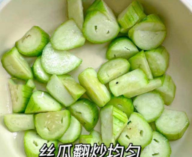 第四步:将锅底调入食用油,加上葱白和蒜末,倒入丝瓜炒至变软,加上适量开水再次煮沸。