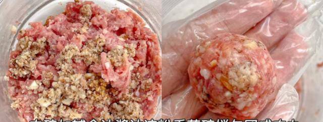 第三步:将香菇洗净去掉蒂,切成一些细末,猪肉反复洗干净,瘦肉剁碎成猪肉末,猪肉末和香菇放在碗中,加上生粉一勺,加上食盐,胡椒粉半勺,调入生抽和蚝油,滴入少许食用油,用筷子搅拌均匀,将其揉搓成丸子,备用。