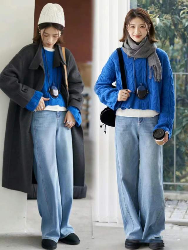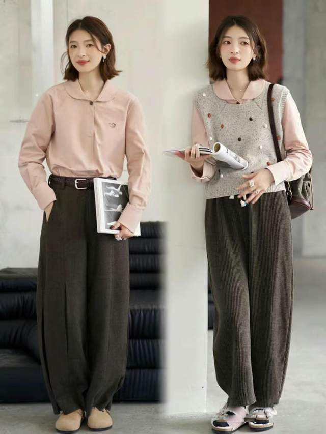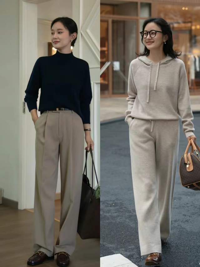 如果腿型实在不是那么完美,加上个子不是很高的女生,我们可以选择阔腿裤,阔腿裤更能把缺点藏起来,而且能够穿出慵懒风,就像下面这两套穿搭示范,用正三和针织衫叠加穿搭,加上阔腿裤就能轻松穿出时髦感了。