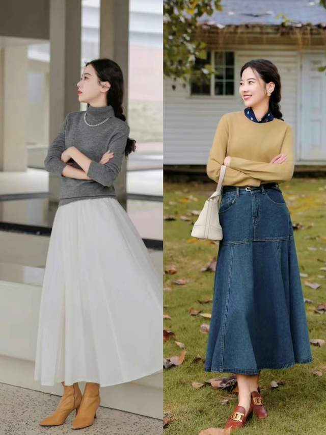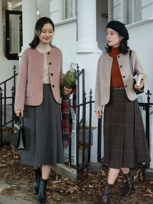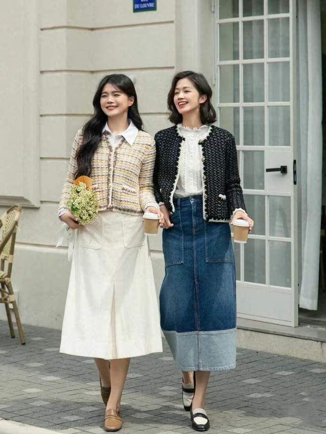 我们还可以选择a字版型的半身裙,穿起来更立体,挺阔有型,和小香风外套组合搭配,散发出了法式复古的氛围感,很适合职场女性通勤穿搭,里面可以搭配一件很有质感的针织衫,显得更加的休闲,落落大方。