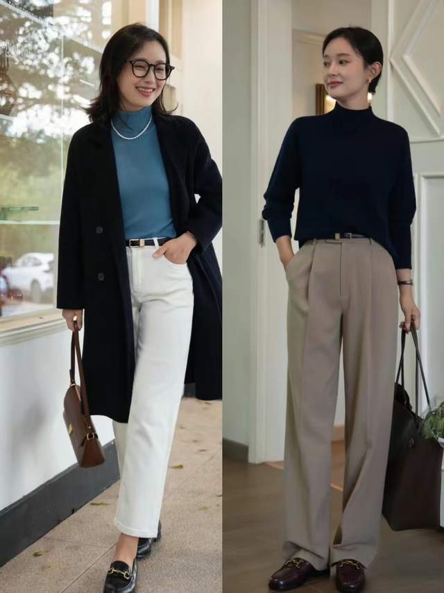 不同场合穿搭的衣服单品也是不一样的,如果想要日常生活中穿起来温柔优雅,落落大方,我们可以选择休闲裤的搭配,但是在职场上班的女性,我们可以选择西裤和针织衫组合,更加的挺阔有型有气质,更干练。