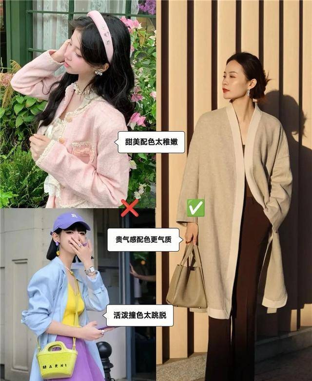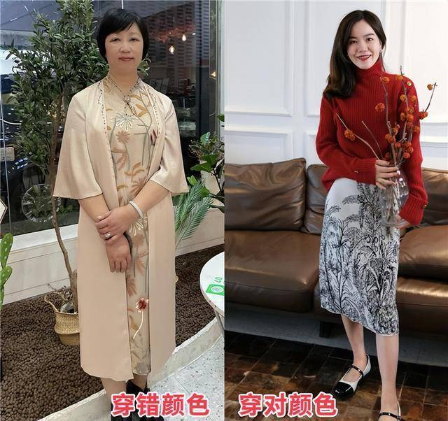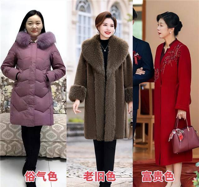 那么什么样的颜色是富贵色呢?下面这张图做出了很好的解析,有很多中年女性所选择的颜色要么太老旧,要么太过于暗沉,而这种富贵色既有一定的亮度,同时又具有提亮肤色修饰气色的效果,让整个人看上去都更年轻贵气。