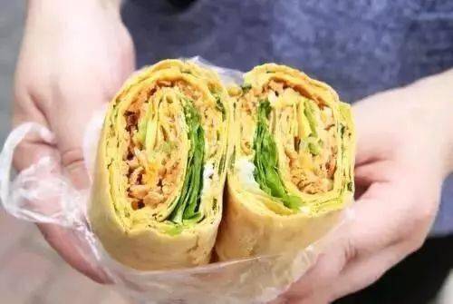 一张如纸的薄饼里面磕着枚鸡蛋、蔬菜、葱花等丰富的材料,营养又好吃,看着老板那敏捷的手法,一浇、一旋、一磕、一撒、一掰、一铲,每个环节思路清晰,手速又快,最后再刷上甜面酱,总共加起来用不着2分钟就能吃到,咬一口香酥脆嫩,早上来一个,一上午饱腹感满满的。