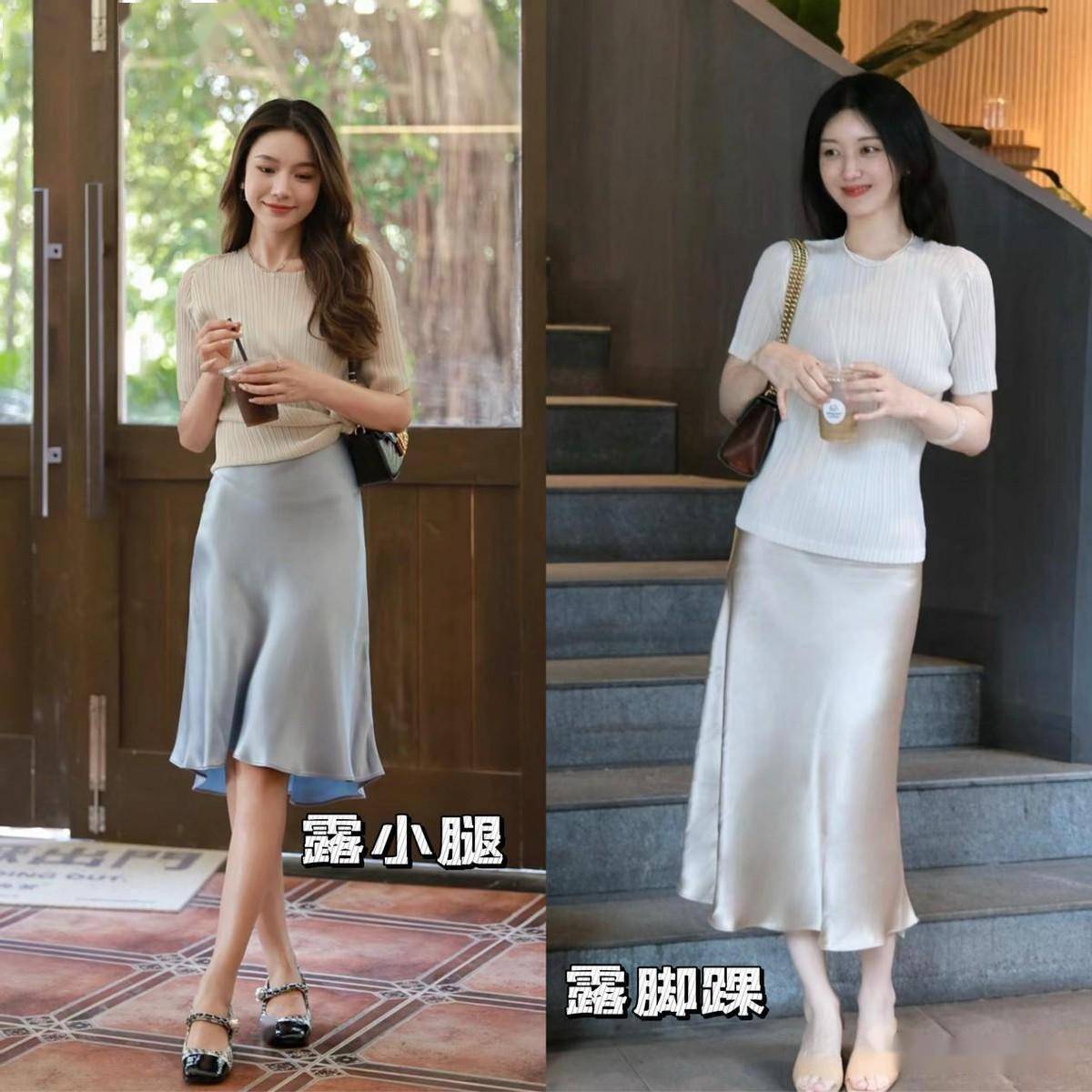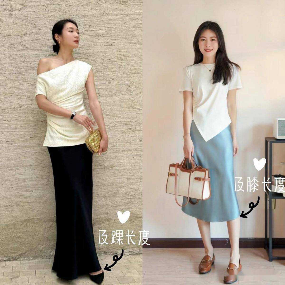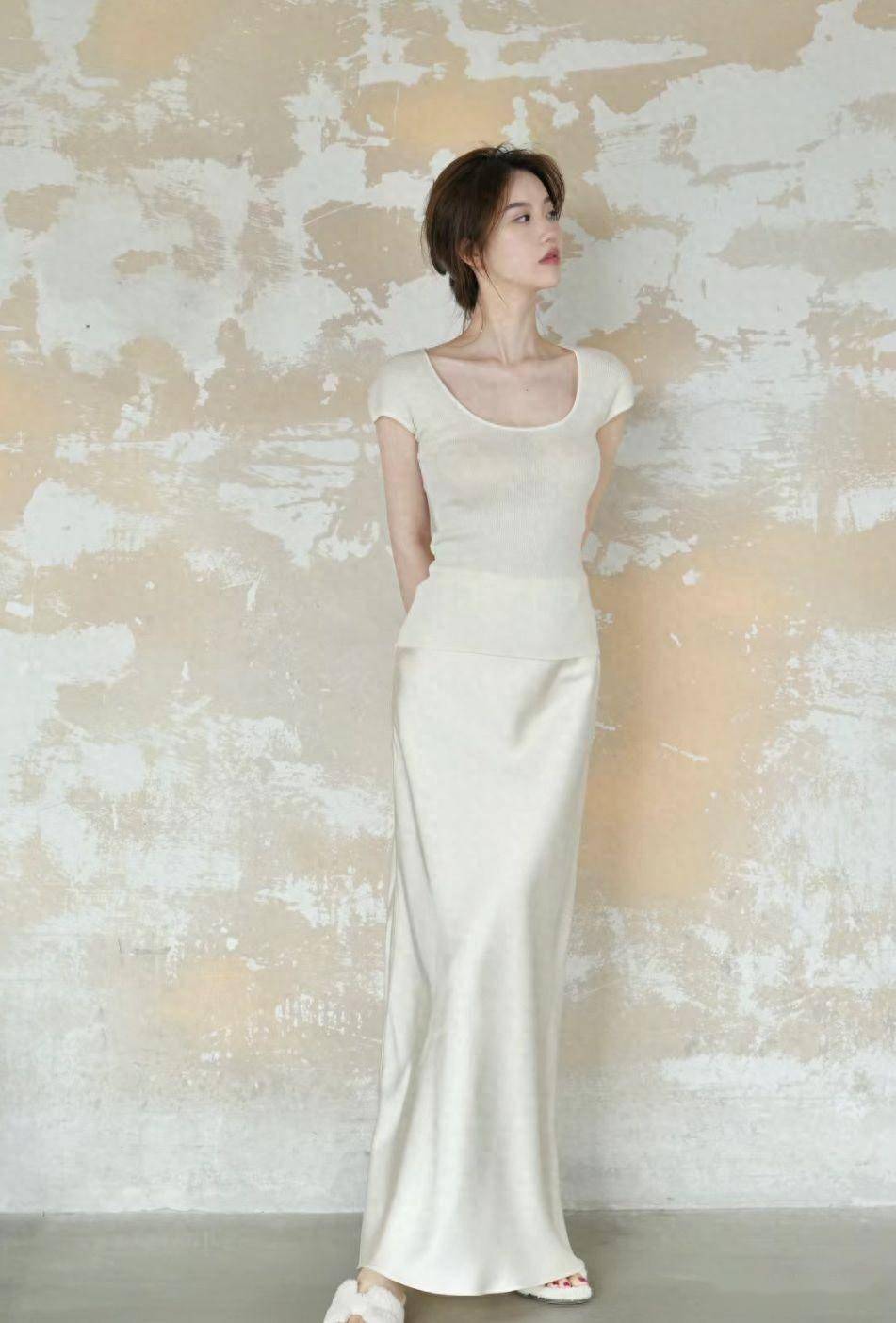 T恤的领口要优先选择圆领、V领或者U型领,从而增添露肤面积,搭配包裹住腰胯位置的醋酸裙,只能掐出腰线,也可以隐藏臀肥、臀部的现象。