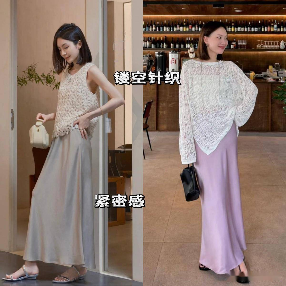 除了服装配色要用对以外,上衣和醋酸裙之间,还应当具备对比的效果。对比感可以体现在面料材质上,尤其是版型宽松的上衣,选择镂空感的针织材质,能够轻松的丰富造型。