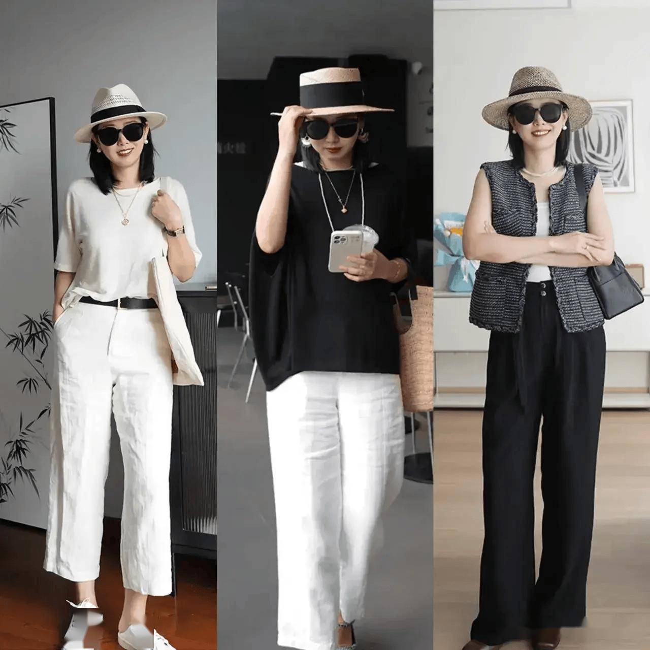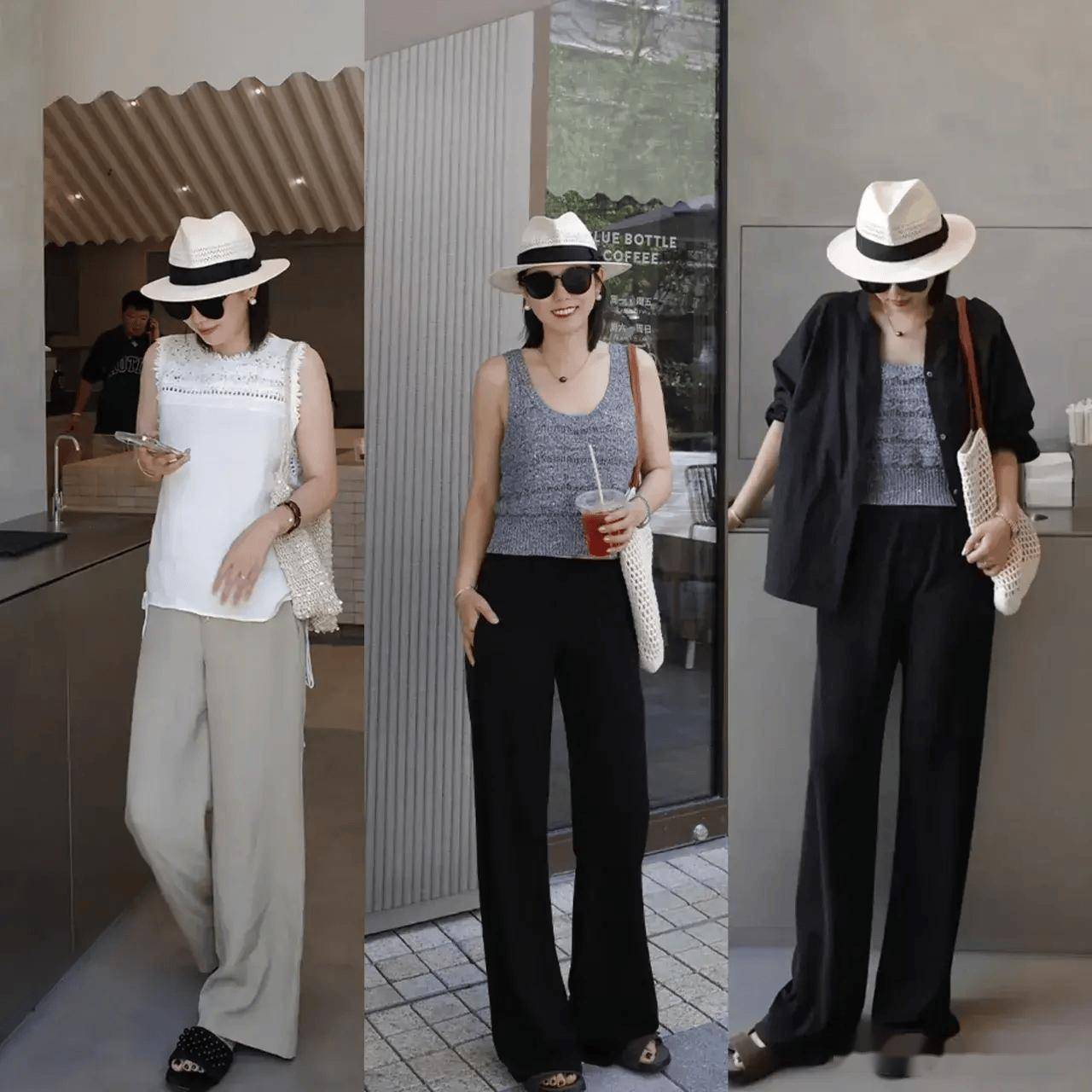 黑色的廓形针织衫,选择了白色亚麻阔腿裤,配色是干净简洁的,看着很清爽,减龄不油腻。灰色马甲搭配黑色阔腿裤,选择了经典的无色系搭配,高级感十足。