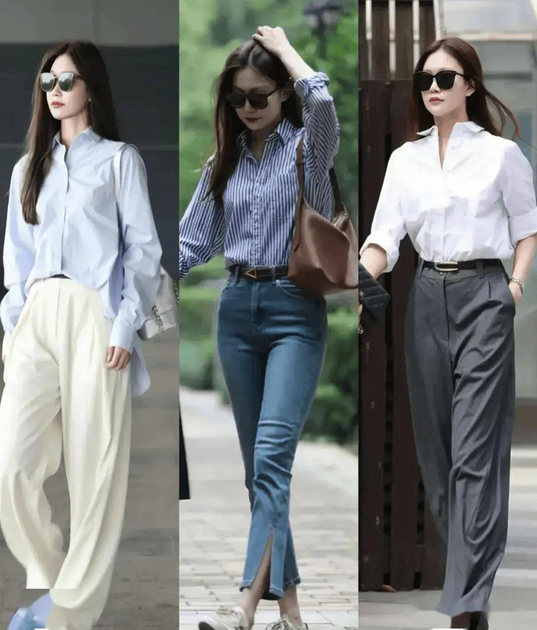 简单的白色衬衫与灰色的阔腿裤很搭,简洁清爽中彰显出知性高级感,无论是通勤还是出游都OK。