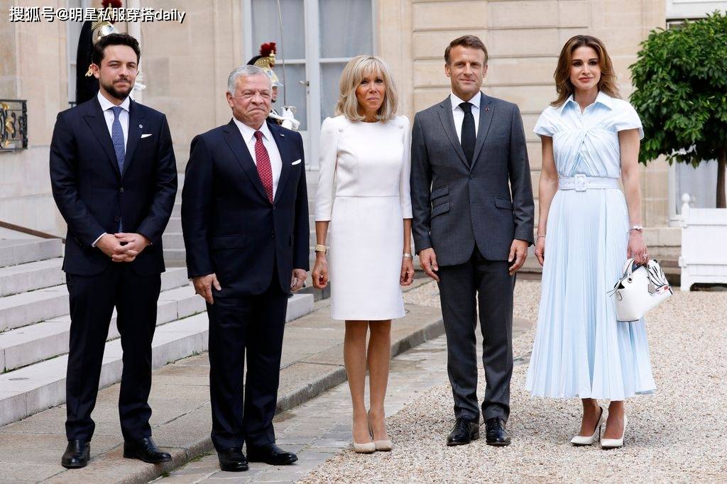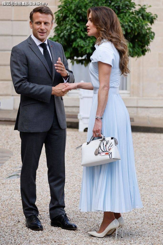 拉尼娅女王在巴黎会见马克龙夫妇时,选择了一款淡蓝色雪纺连衣裙,瞬间化身成为优雅的代名词。这款Brandon Maxwell连衣裙,以其无肩带紧身胸衣、内置衬衫、系腰带腰线和百褶裙等多种元素的巧妙融合,完美展现了拉尼娅女王的好身材与高贵气质。