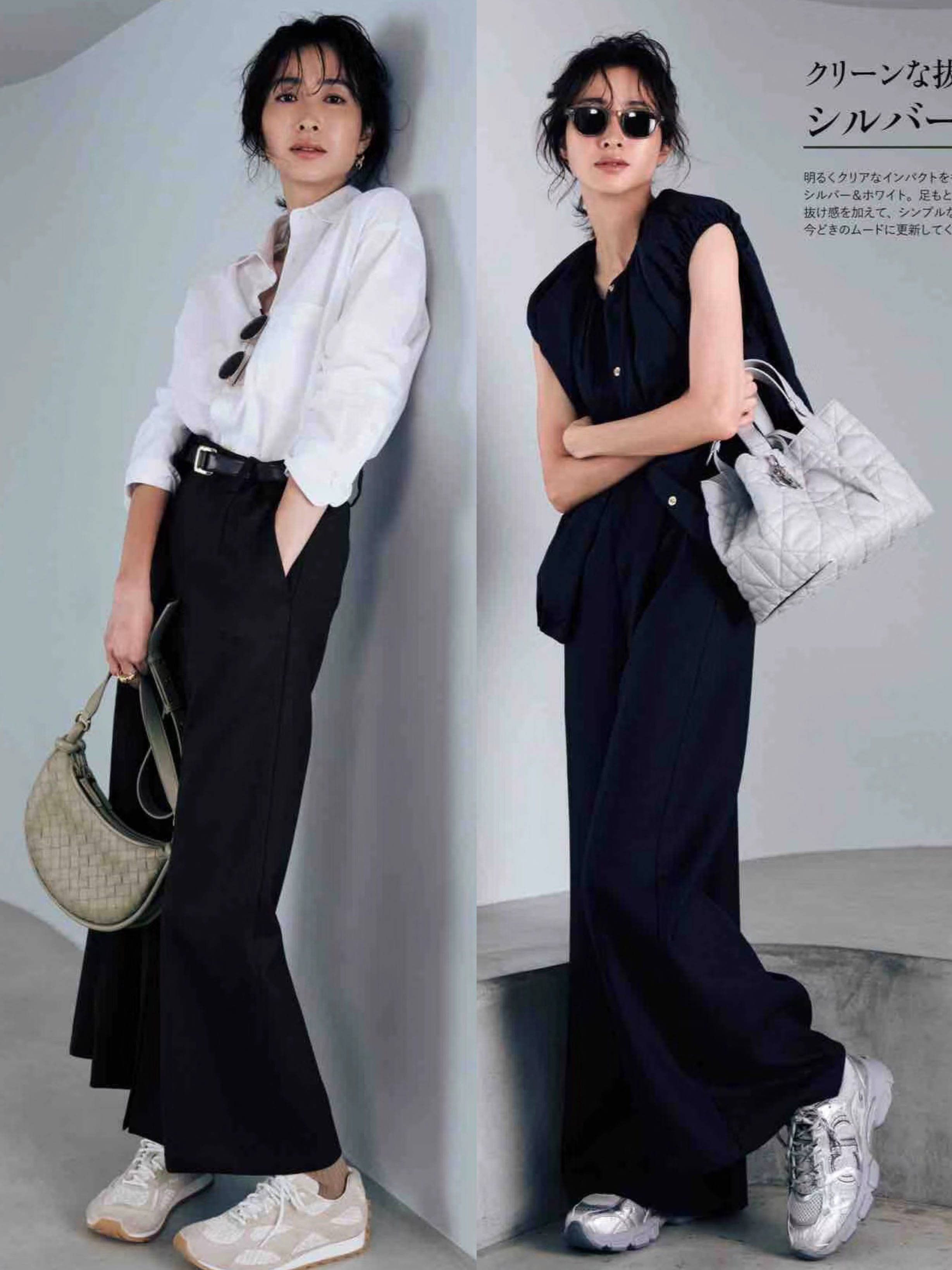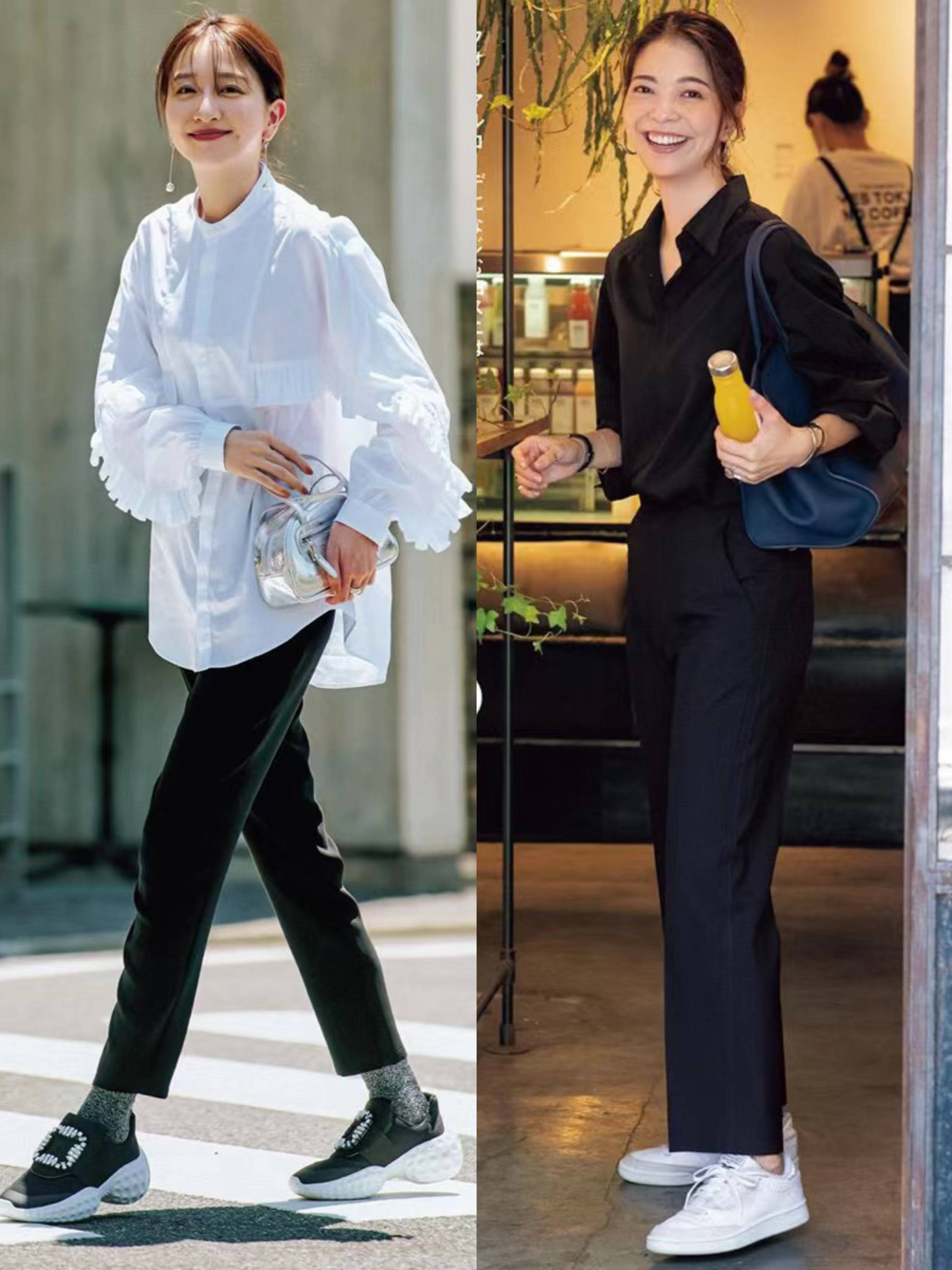 一条修身的黑色九分裤,搭配黑白撞色的老爹鞋,露出脚踝位置,时髦洋气、显高还显瘦。撞色老爹鞋,经典的黑白配色、百搭又显高。