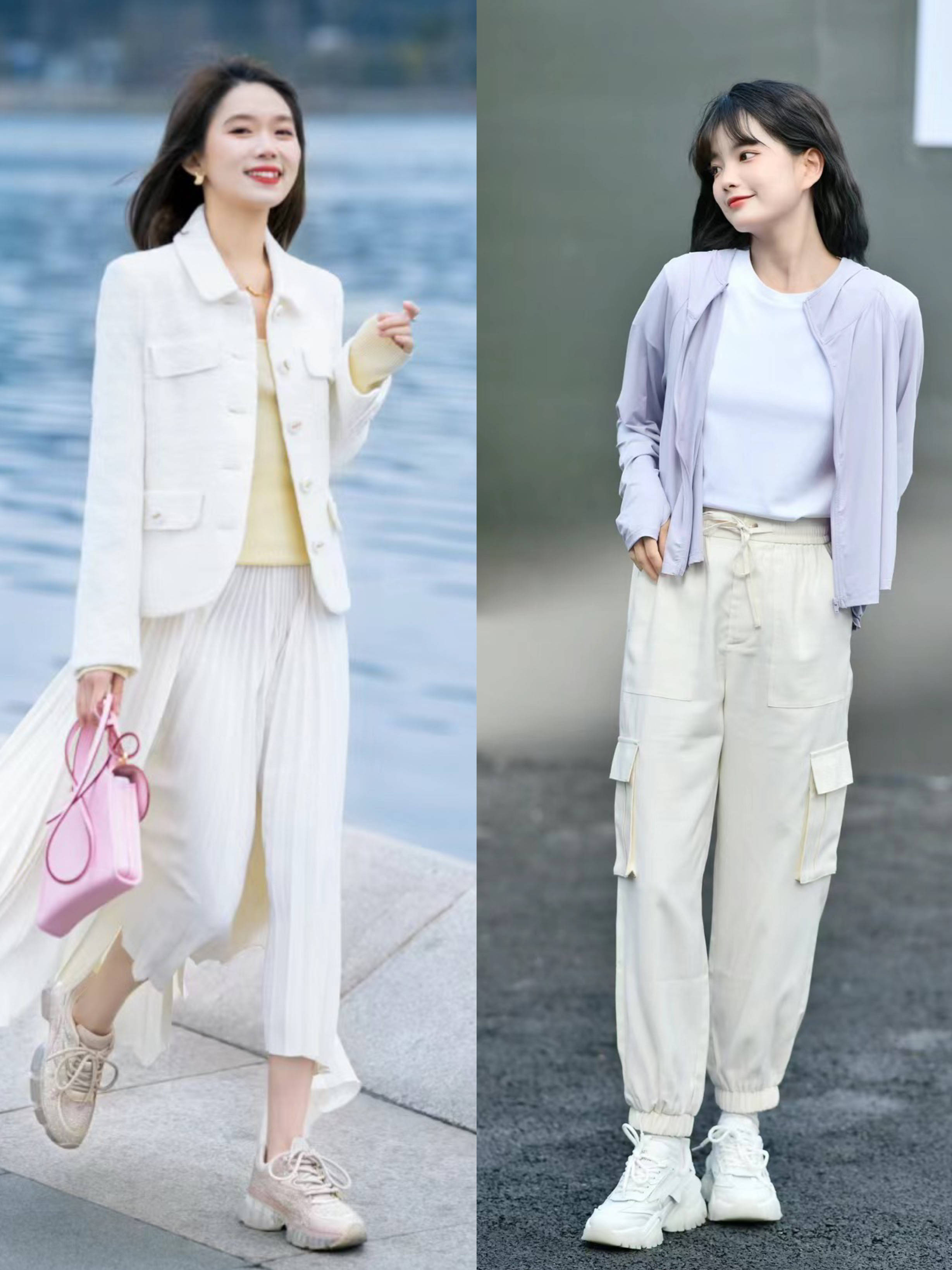 老爹鞋与九分裤,选择同色或者邻近色。比如工装风的九分裤,选择了米白色的颜色,配上奶油白的老爹鞋,清爽醒目又很洋气。