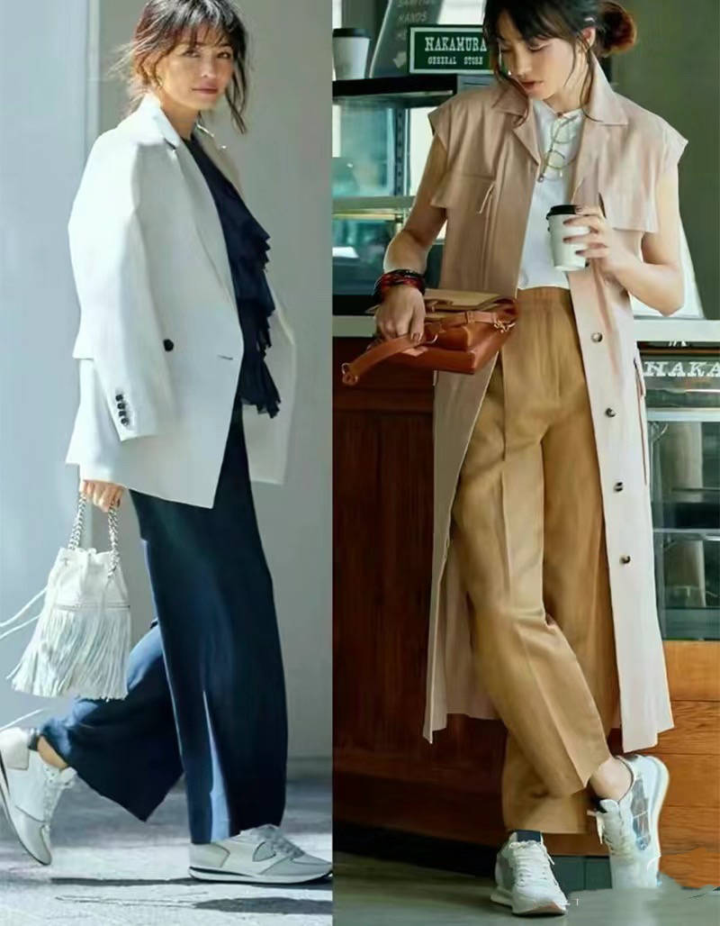 如果我们选择了一双小撞色的老爹鞋,就是大面积的白色,辅助小面积的其他人颜色。比如白色老爹鞋+少许绿色修饰,就简单又有活力。
