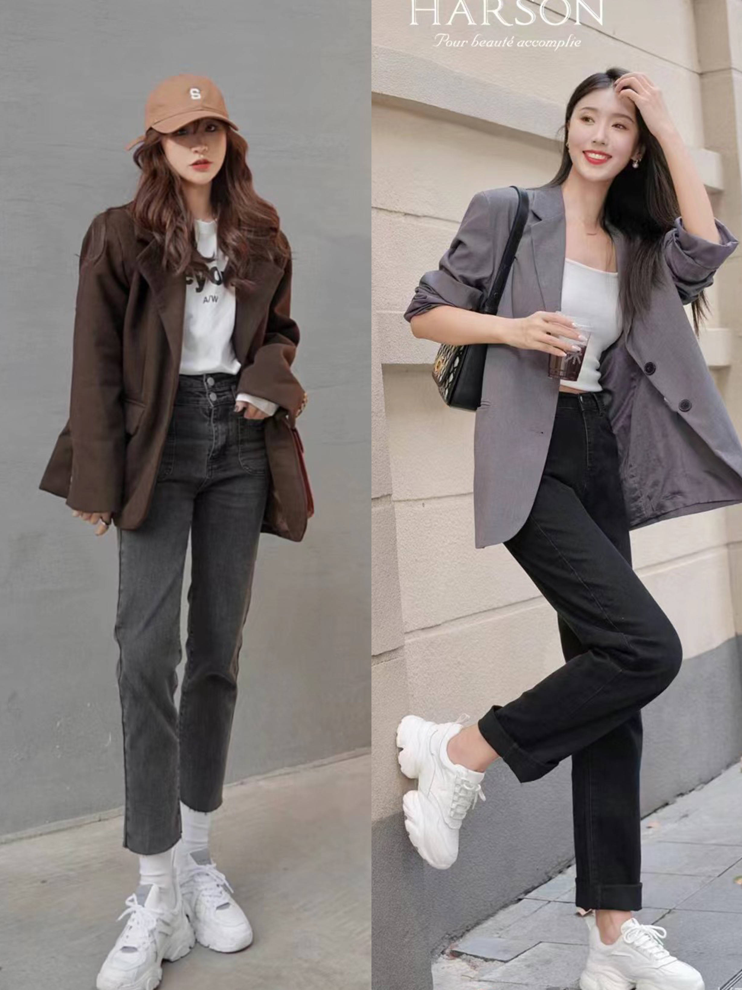 卡其色+深蓝色的撞色外套,九分牛仔裤、卡其色老爹鞋,这配色也很绝。牛仔裤与深蓝色系呼应,整体造型又酷又美。