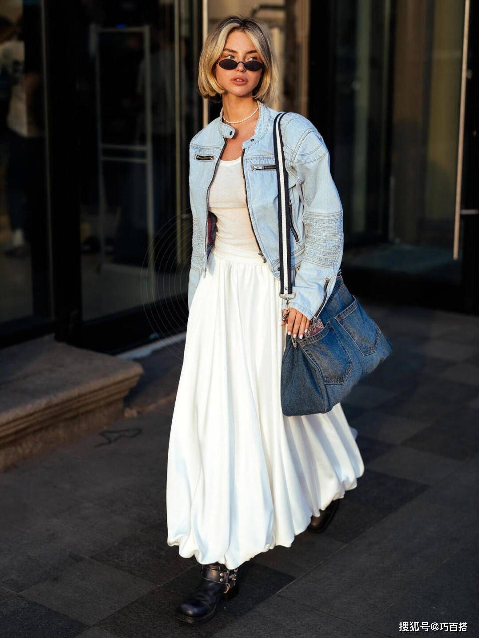 早秋温度和氛围,半身裙和牛仔外套的出场率非常高,喜欢这类单品的姐妹,可以选择了,从她的上身效果来看,选择浅色系效果最佳,纯白色半裙和水洗蓝牛仔外套的结合,清秀文艺,温柔似水的视觉效果,别提有多nice!