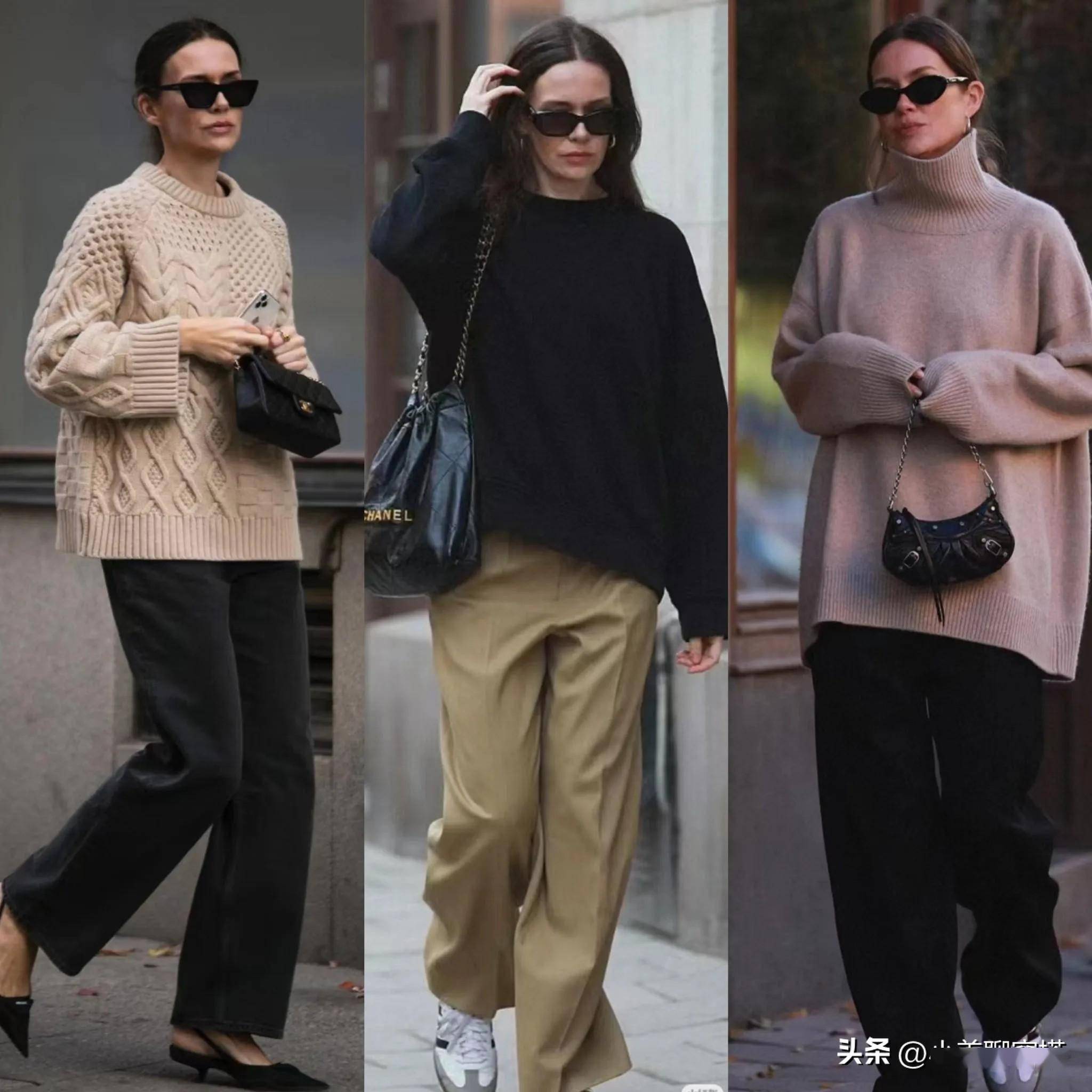 秋天的时候,一件卡其色的宽松毛衣,自带温度有一种亲切感,搭配黑色的阔腿裤,给人一种慵懒的松弛感,简简单单单的却感觉很时髦。